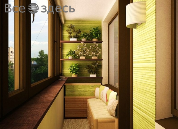 Поклонники цветов могут сделать на балконе небольшую оранжерею. Тем, кому необходимо помещение для отдыха, могут в углу разместить небольшой диван, а рядышком поставить журнальный столик. Аксессуары лучше подбирать не громоздкие, иначе помещение будет выглядеть неуютно (фото 8).
