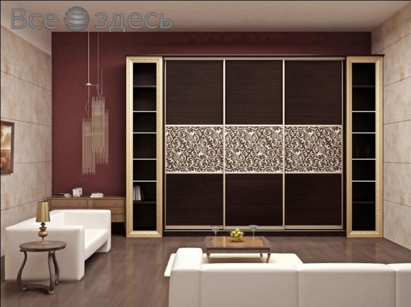 Конечно, самой красивой частью шкафа-купе является дверца. Для гостиной специалисты советуют подбирать дверцы с эффектными фотоизображениями, витражами, сделанные из рифленого или матового стекла. Немаловажно и внутренне наполнение шкафа. Для гостиной можно выбрать шкаф с полками, сейфом, отделом для стереоаппаратуры, мини-холодильником или мини-баром (фото 7).