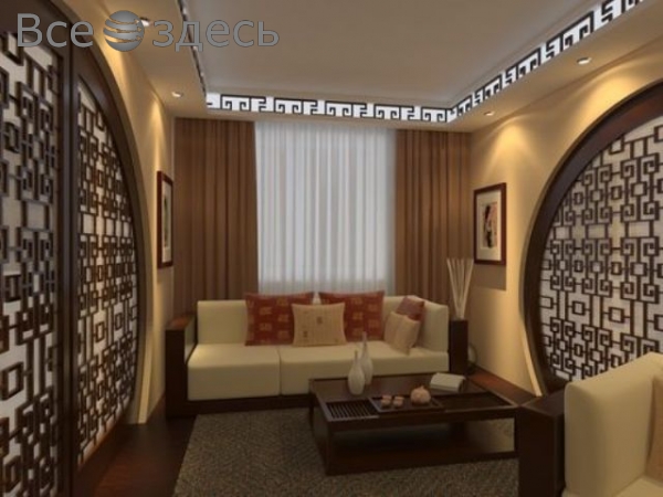 Сейчас популярностью пользуется японский стиль оформления зала. Для этого стиля характерна простота и свобода передвижения. То есть, в зале должно быть минимальное количество мебели. Альтернативой может быть и мебель-трансформер. Такая мебель располагается вдоль стен (фото 4).