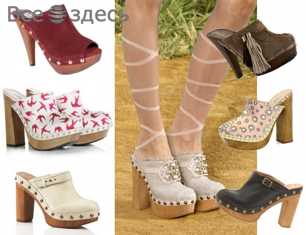 Женские сабо принято называть еще клогами. Классическая модель имеет пробковую или деревянную подошву, а также устойчивый и удобный каблук. Дизайнеры предлагают закрытые и открытые модели сабо как на большой платформе, так и на маленькой. Верх такой обуви может быть декорирован кнопками, бантами, бисером, заклепками, лентами, вышивкой, мехов, контрастными вставками и даже декоративными цветами (фото 2).