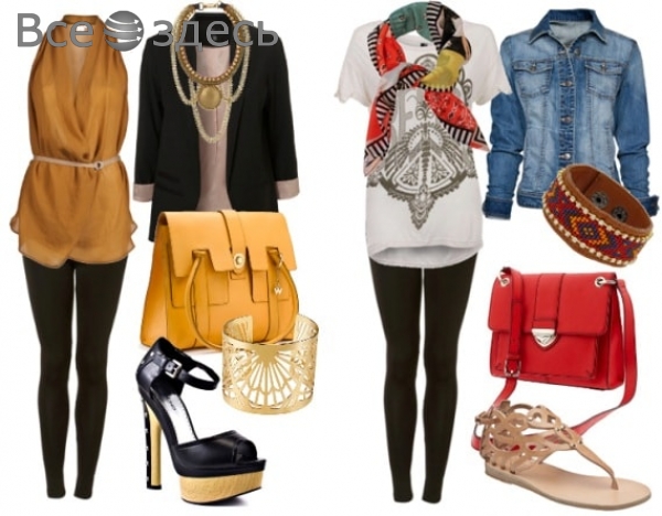 Отлично леггинсы смотрятся в сочетании с длинной рубашкой. Она прикрывает ягодицы, поэтому такой образ могут примерить и обладательницы пышной фигуры. Если девушка имеет стройную фигуру, то ей можно сочетать леггинсы с короткими рубашками и даже топиками. Невысокие барышни могут сочетать их с коротким верхом, а высоким лучше подбирать что-то подлиннее. Дизайнеры рекомендуют в качестве верха надевать пиджак или кожаную курточку (для весны). На рубашку можно надеть широкий пояс. Из обуви подойдут ботильоны, а также туфли и босоножки (фото 2).