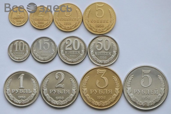 В Советском Союзе с 1921-го по 1991-й годы в обращение выпустили большое количество монет. Самым известным комплектом для нумизматов является комплект монет, на которых стоит 1958-й год чеканки. Сегодня они не являются мегараритетными, но позволить их себе могут не все коллекционеры, ведь цена на них достаточно дорогая. Так, за монету номиналом 1 копейка просят около 250 у.е., а цена за копейку в 1 рубль может достигать 500 у.е, а за самую редкую в 3 рубля - более 2000 у.е. Подробнее о ценах на монеты можно спросить вот здесь.