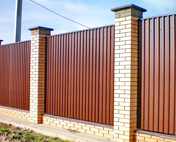 Видов заборов, в изготовлении которых используется металлопрофиль, действительно много. В создании столбов опорных могут быть задействованы: кирпич, бетонные монолитные конструкции, облицовочная морозостойкая декоративная плитка либо декоративный кирпич. Кстати, столбы могут поделить забор на отдельные секции, добавляя этим большую привлекательность и декоративность. Сам профнастил может быть таким: красным, бордовым, серым, коричневым, синим, зелёным, цвета мокрого асфальта, дерева, камня.