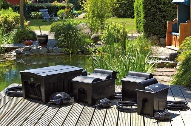 Модульные или многокамерные фильтры отличаются большой мощностью и эффективностью. Применяются для крупных водоемов, в частности, тех, в которых разводят рыбу. Монтируются на берегу. Конструкция включает в себя камеры, в которых находятся фильтрующие материалы. Вода, при поступлении в резервуар, переливается из одной камеры в другую и таким образом аэрируется. Из минусов: большие объемы, поэтому трудно задекорировать и большая цена.