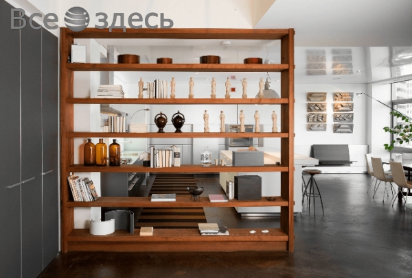Прочной должна быть средняя полка, так как она подвержена наибольшим нагрузкам. Для закрепления полок используйте металлические уголки. К некоторым полкам можно прикрепить дверцы. Благодаря такой конструкции стеллаж можно будет использовать каждый день и его внешний вид станет оригинальным и удачным украшением жилой комнаты (фото 5).