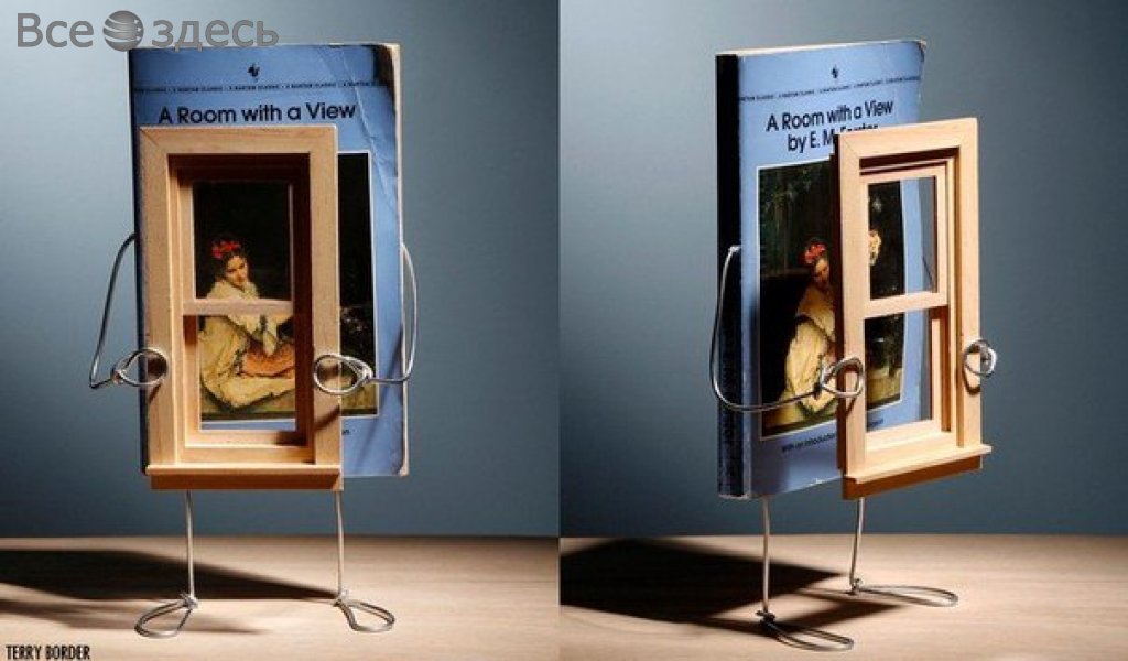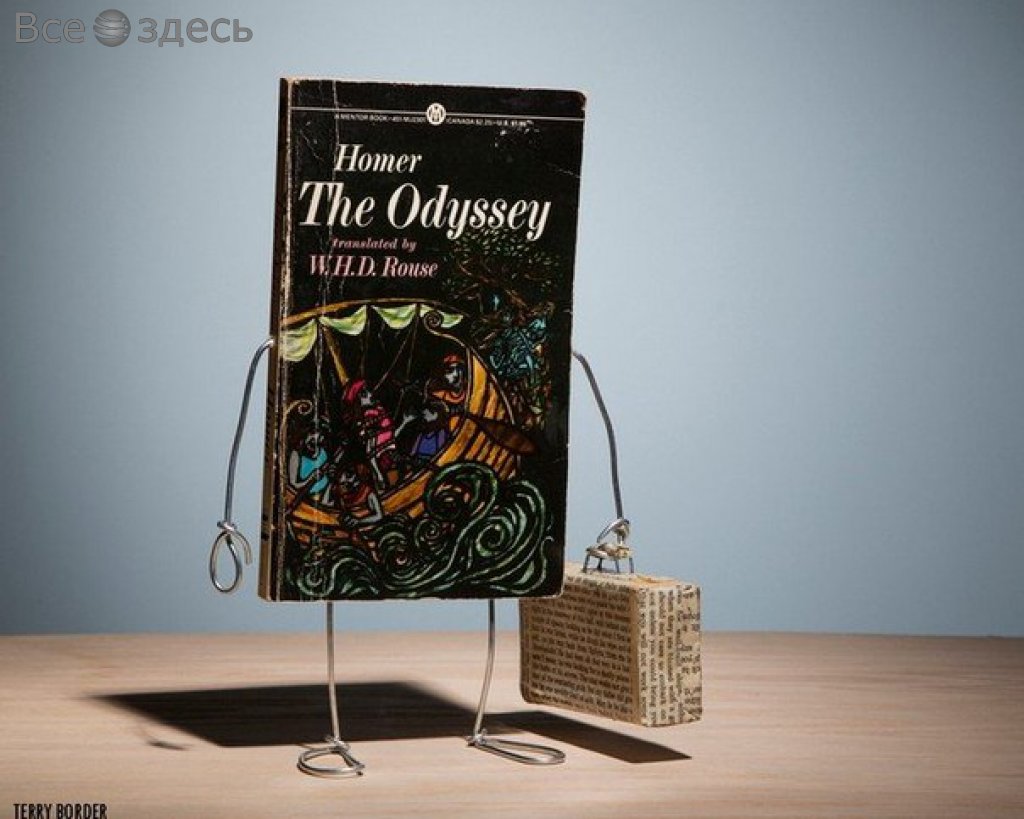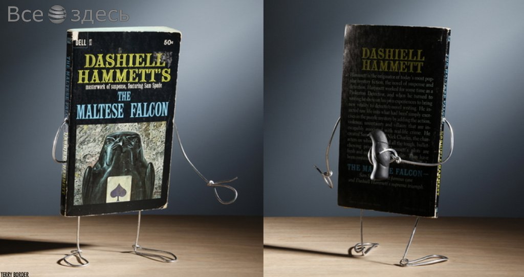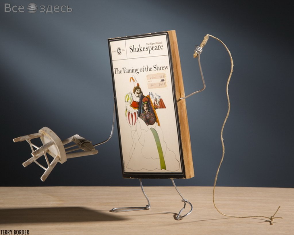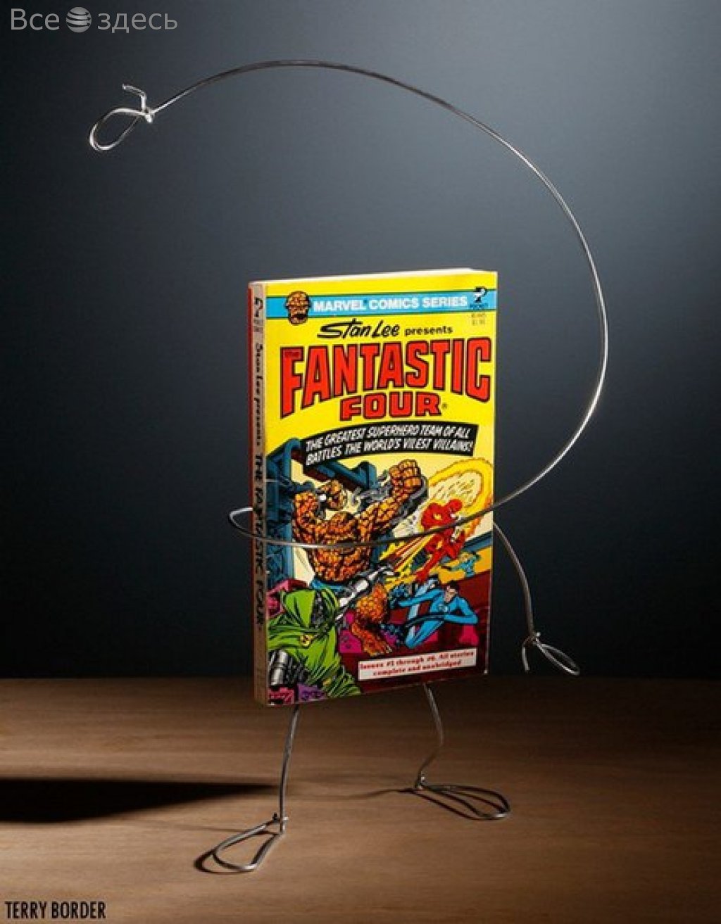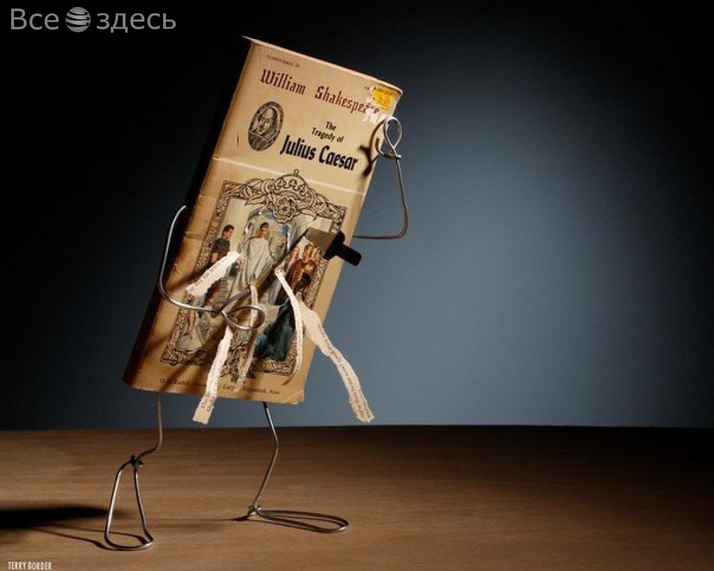 Художник и фотограф по имени Терри Бордер родился в Индианаполисе. Он создал очередную интересную серию работ. Ее название - Wiry Limbs and Paper Backs, что переводится, как проволочные ноги и бумажные спины. Внутренее содержание известных книг в этой серии он смог выразить в уникальном собственном стиле. Возможно, из-за проволочных ножек это выглядит несколько комично, но суть содержания Терри удалось отобразить очень точно. Особенно забавно выглядит преобразившаяся книга «Дракула» Брема Стокера, которая закутана в черный плащ по аналогии со своим клыкастым главным героем.