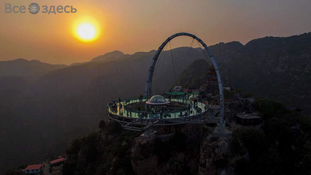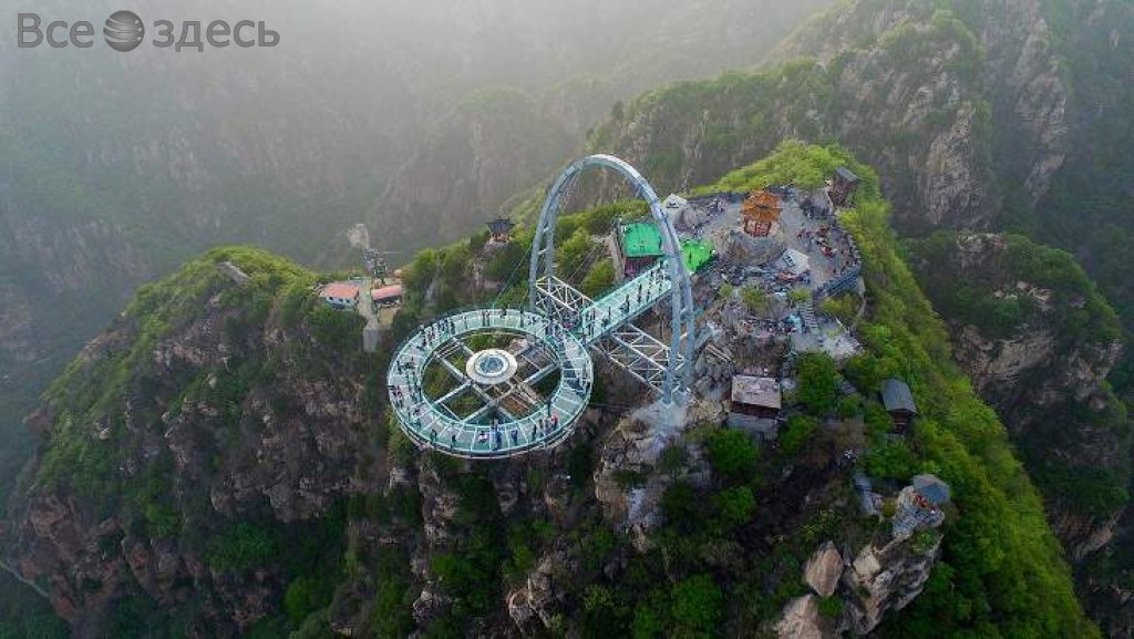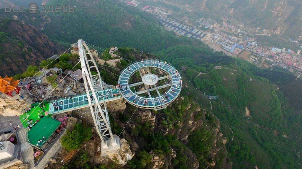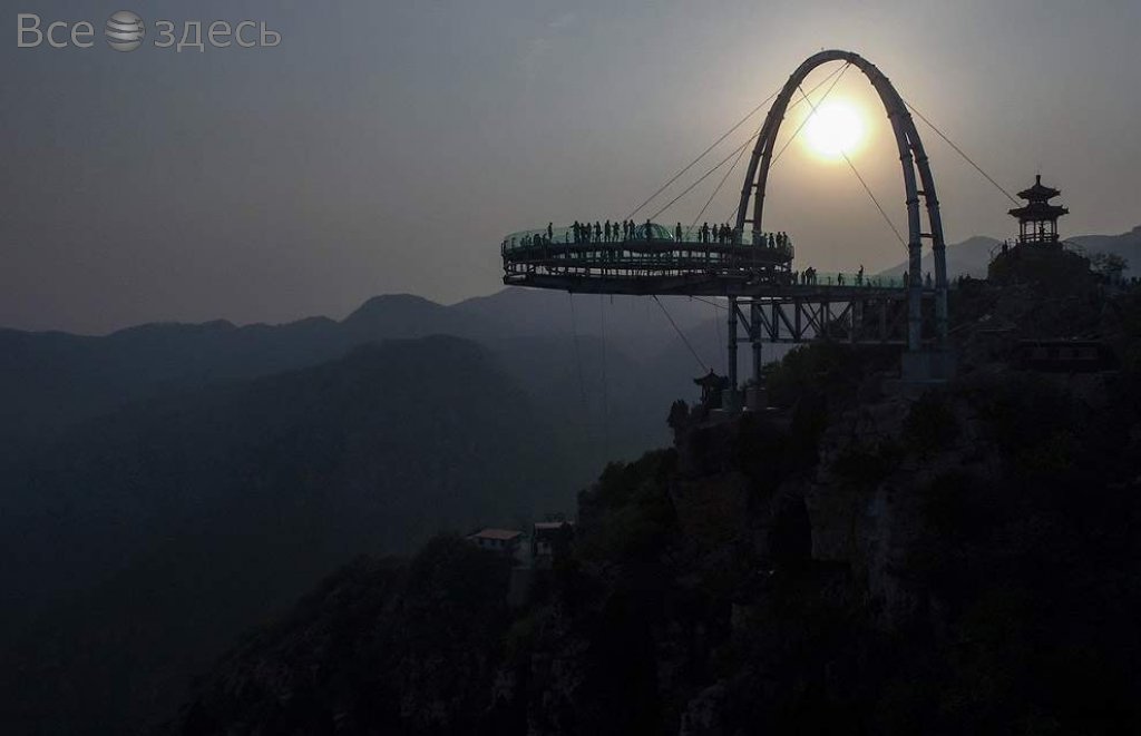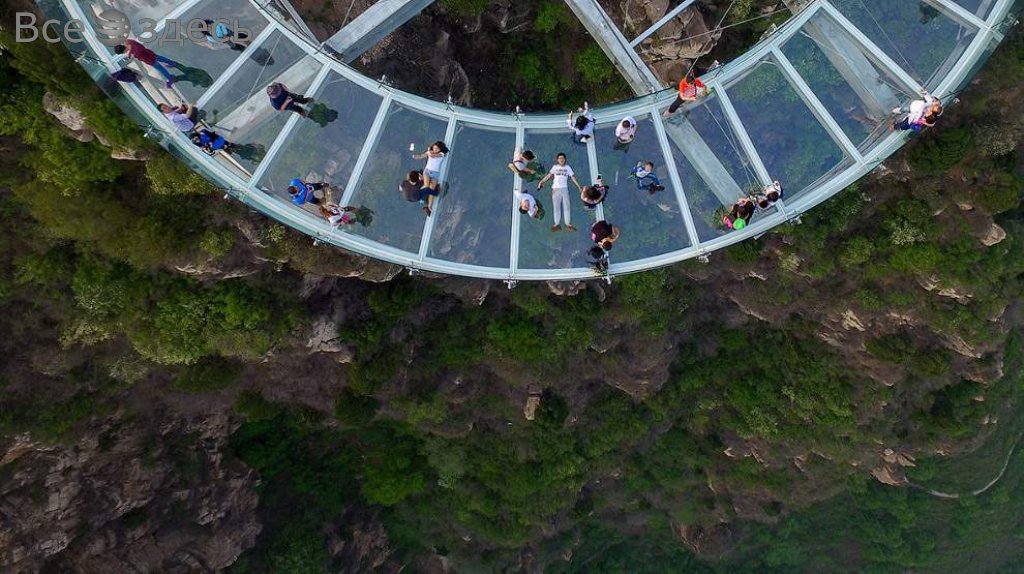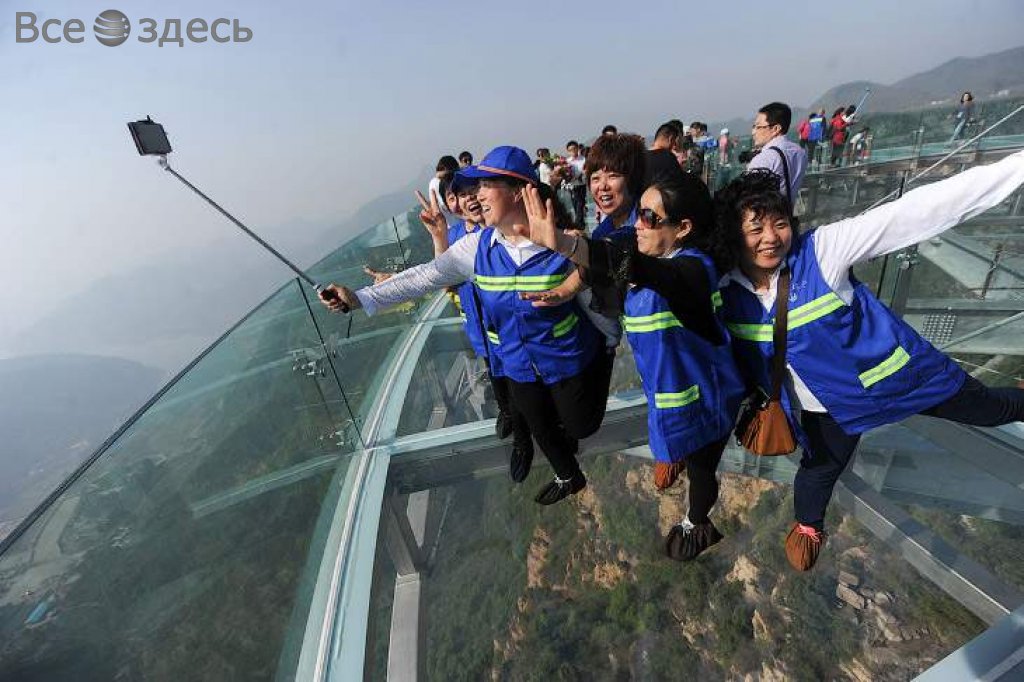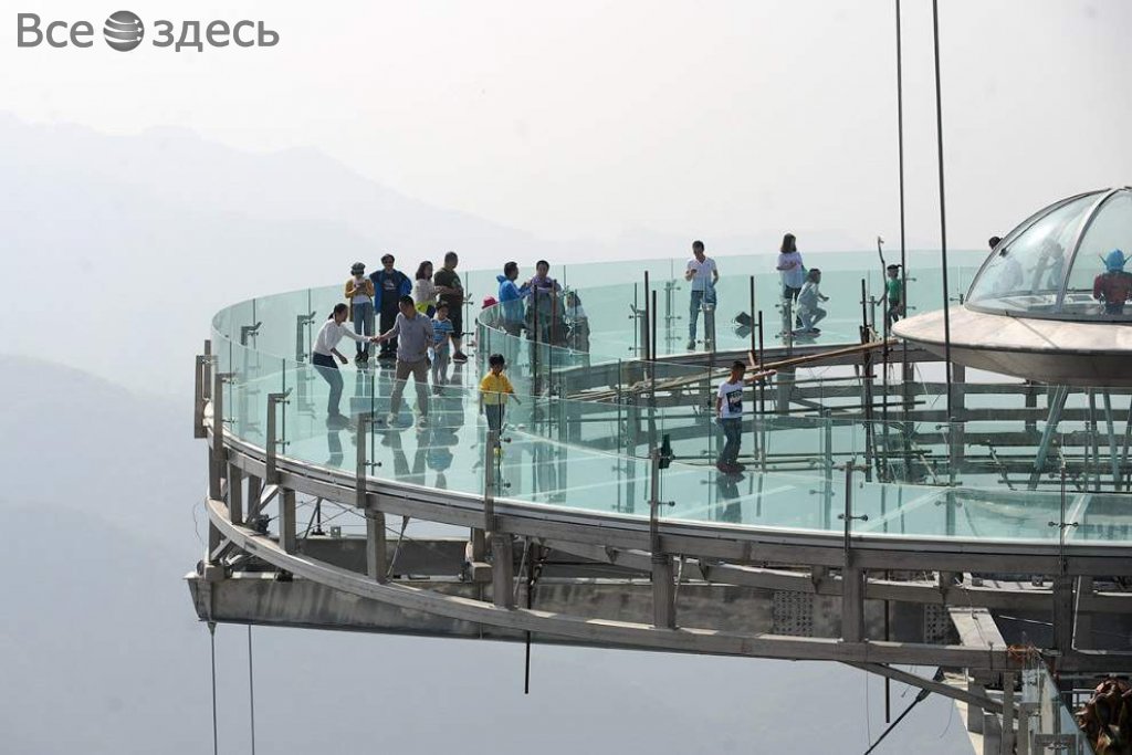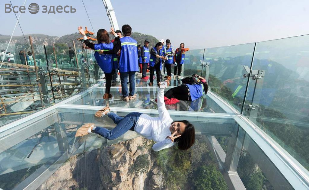 Сделан он был в Китае. Там оборудовали несколько стеклянных подвесных мостов непосредственно над пропастями, сделали и стеклянные дорожки вдоль скал. А еще одна смотровая прозрачная площадка, сделанная из стеклянного материала, недавно появилась там же. Она торчит на краю высокой горы на уровне четырехсот метров прямо над живописной долиной. Выступает она из скалы на тридцать два с небольшим метра. И прийти сюда без фотоаппарата – преступление.