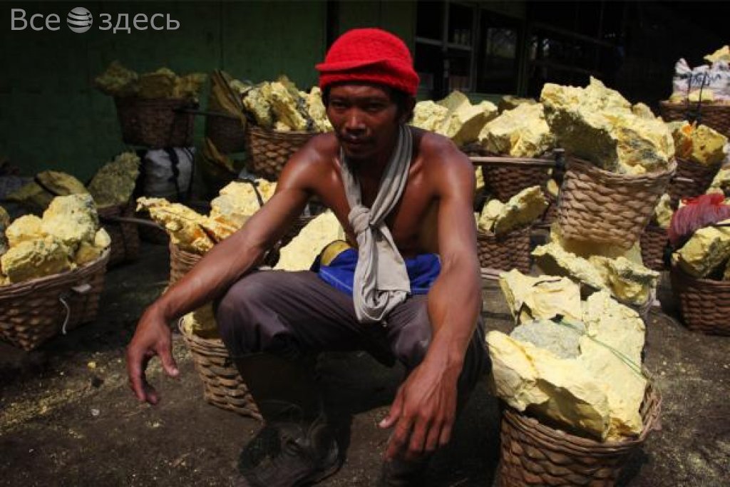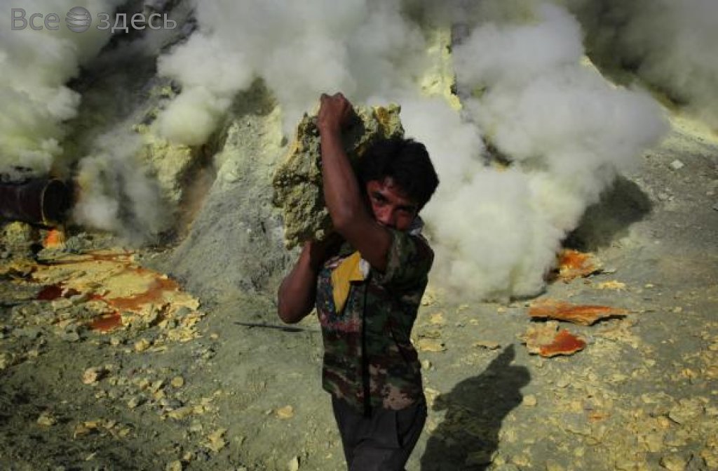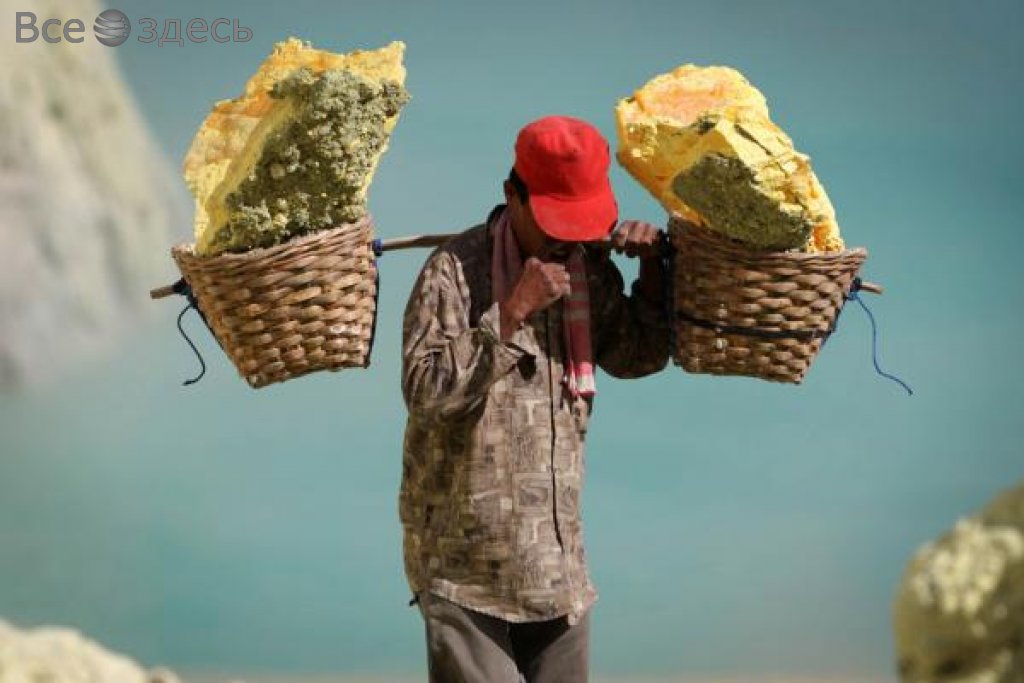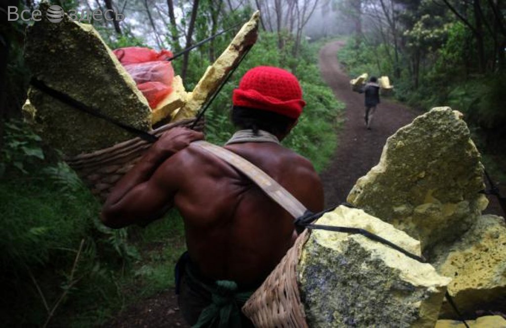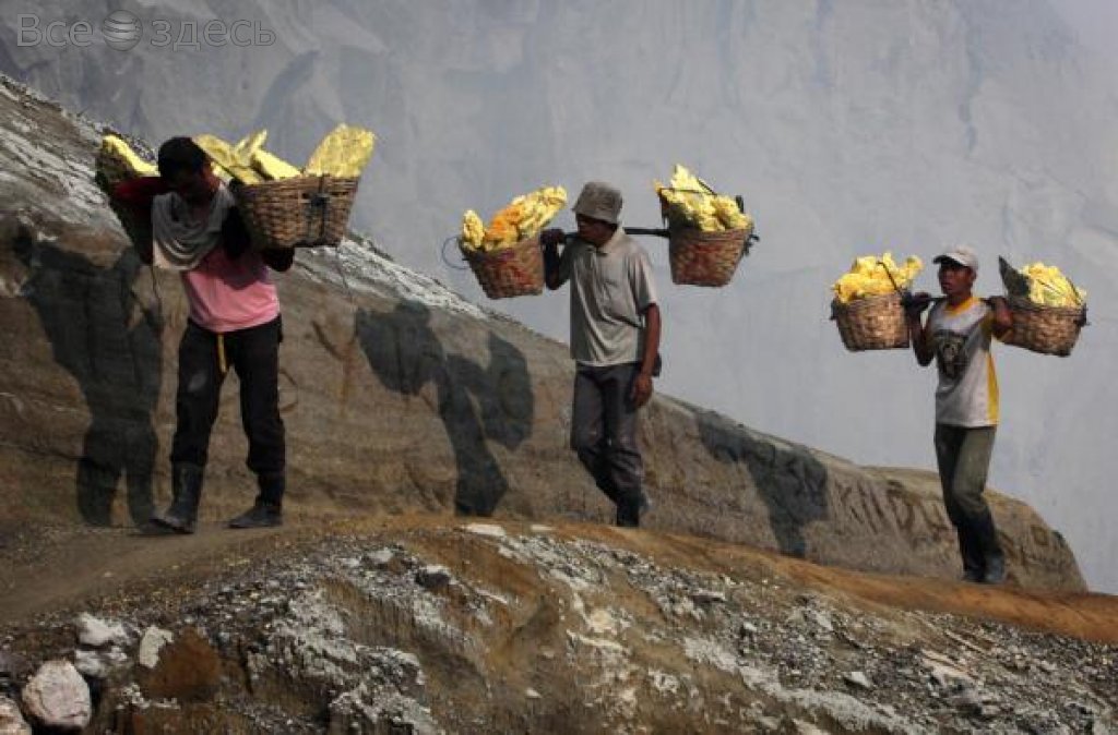 Тут добывают серу в немыслимых условиях. Без специальной одежды носильщики выносят по семьдесят-восемьдесят килограммов сырья, используя лишь свои спины, на которых тащат корзины. За день такой работы носильщик получает около пяти долларов. Молодые мужчины быстро стареют, они едва переходят рубеж в тридцать лет. Серу в дальнейшем используют для различных промышленных процессов.