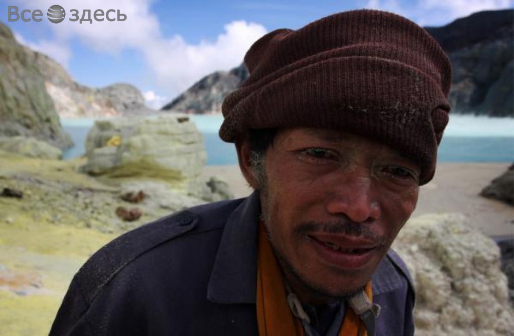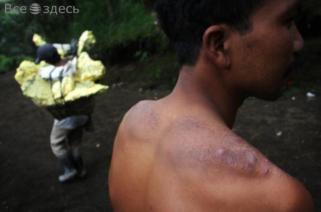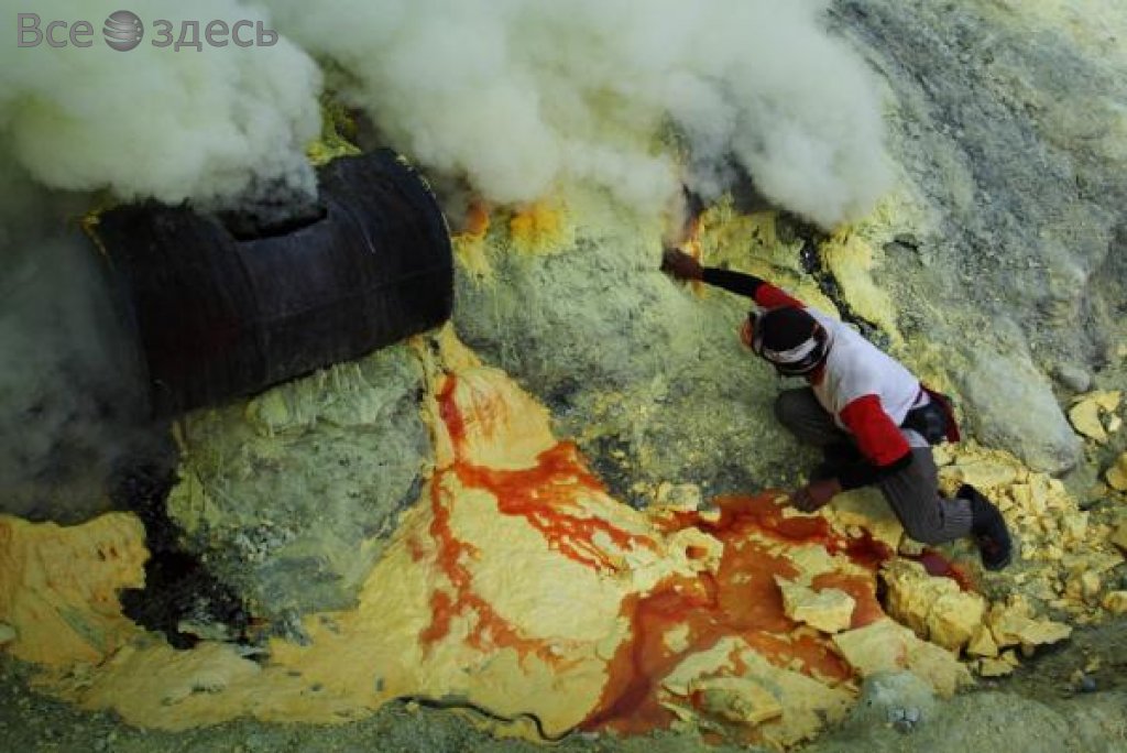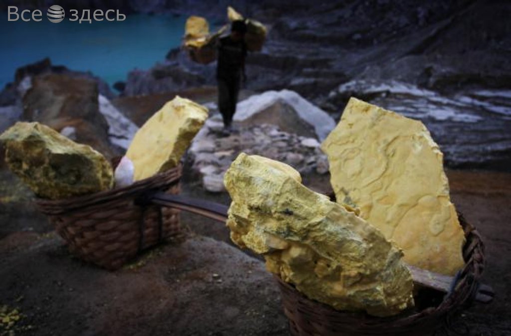 Тут добывают серу в немыслимых условиях. Без специальной одежды носильщики выносят по семьдесят-восемьдесят килограммов сырья, используя лишь свои спины, на которых тащат корзины. За день такой работы носильщик получает около пяти долларов. Молодые мужчины быстро стареют, они едва переходят рубеж в тридцать лет. Серу в дальнейшем используют для различных промышленных процессов.