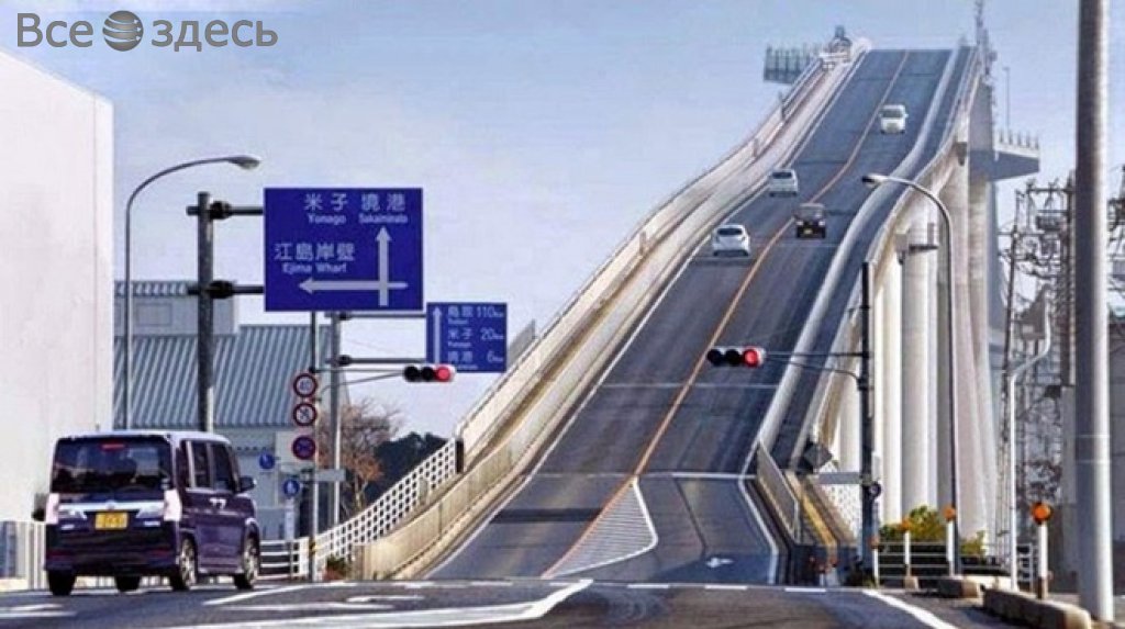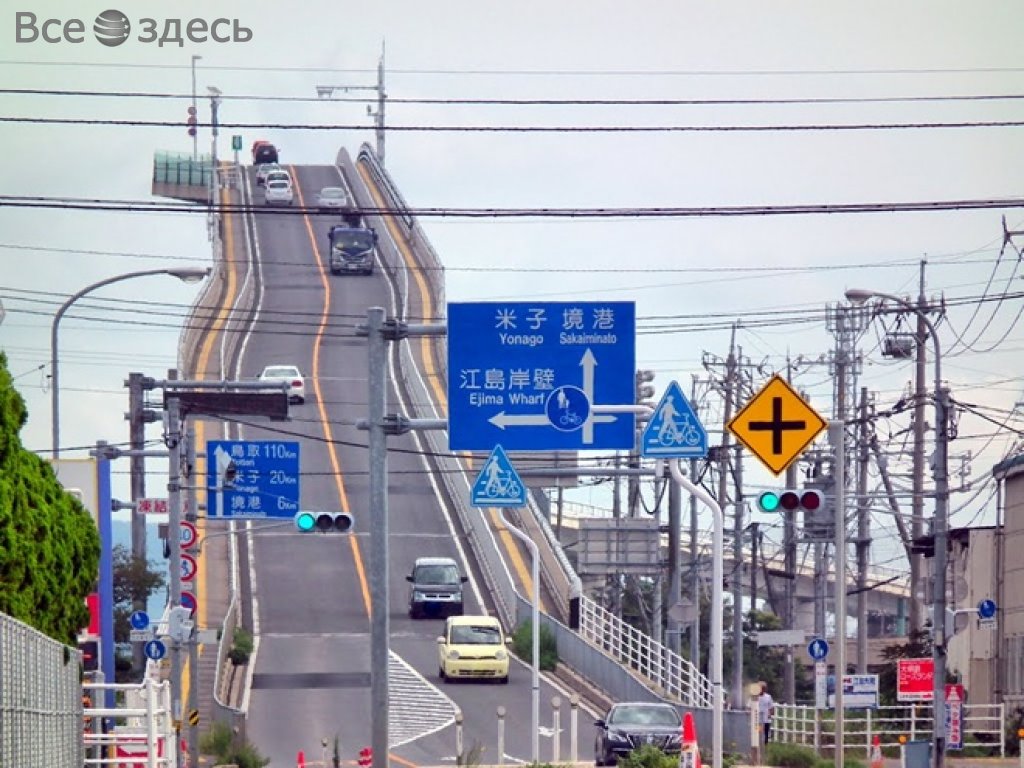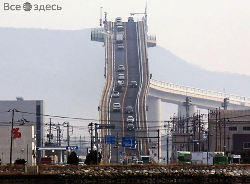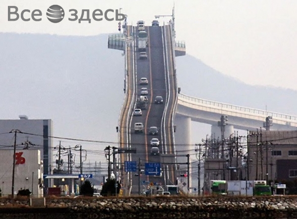Мост Эшима Охаси установлен в Японии. Он одним своим шикарным видом новичков-туристов он приводит в состояние шока. Если на него посмотреть со стороны, но создается впечатление, что автомобили реально катятся в пропасть. Однако, в действительности, он полностью безопасен, а такая высота данному мосту нужна, чтоб под ним проходили корабли. Такой мост является в мире третьим по величине, если сравнивать мосты, имеющие жесткую конструкцию. Протяженность моста составляет километр семьсот метров. Его ширина – одиннадцать метров триста сантиметров. Данный мост соединяет Мацуэ и Сакаиминато - крупные населенные пункты.