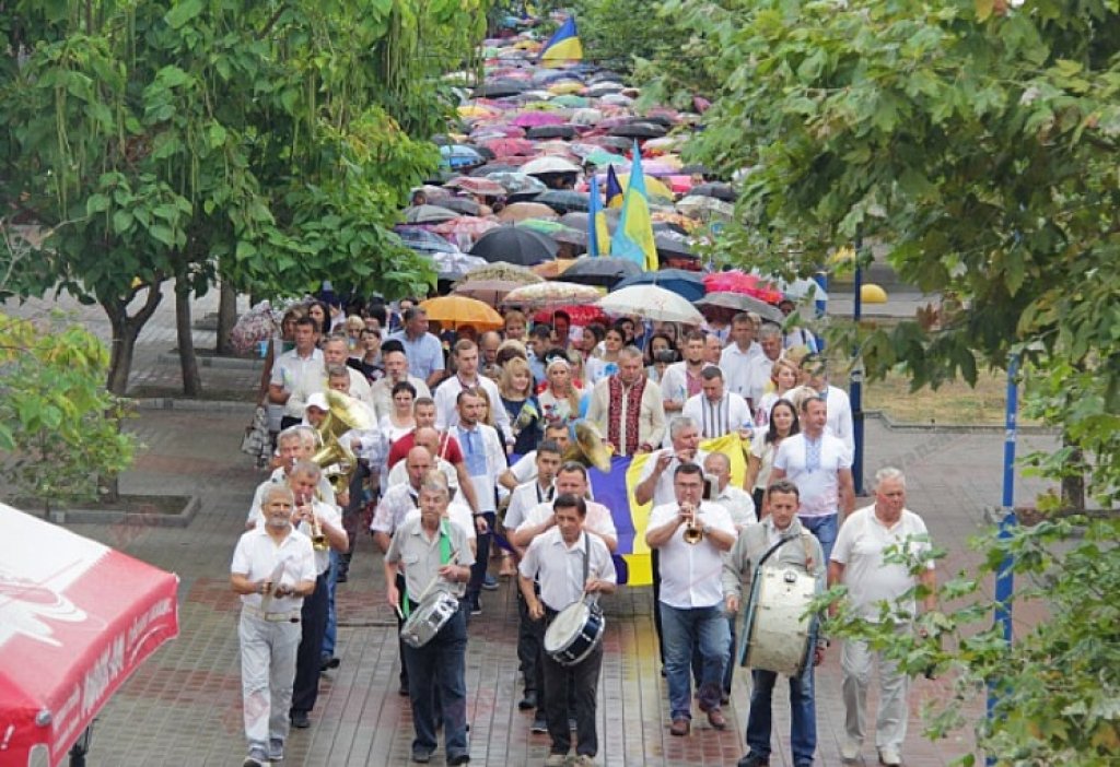 А в Бердянске (Запорожская область) отметить праздник горожанам не помешал даже проливной дождь. Местные жители и гости города под зонтами прошлись приморской площадью в честь Дня флага.