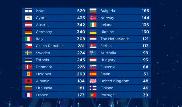 25-летняя израильтянка получила 529 баллов, что позволило ей лидировать с большим отрывом от остальных участников конкурса эстрадной песни. Исполнительный директор конкурса Йон Ола Санд, обращаясь к Нетте Барзилай, назвал ее победу потрясающей. На втором месте в этом году – Элени Фурейра из Кипра (436 баллов), Третье заняла представительница Австрии Сезар Сэмпсон, у нее – 342 балла. Украинец Константин Бочаров – на 17-ой строчке рейтинга исполнителей. Интересно, что от жюри конкурса он получил всего 11 баллов. Их отдали представители Азербайджана и Молдовы. С последнего места украинца подтянули на 17-ое зрители ряда стран, добавив ему еще 119 баллов. На сцену Лиссабона Константин он вышел первым с песней Under the ladder.