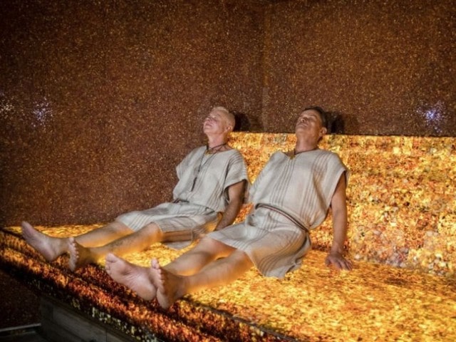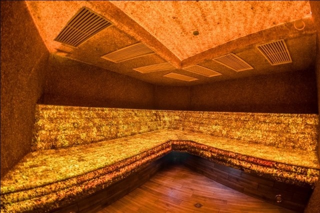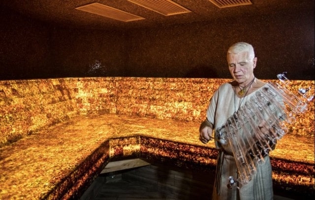 Площадь янтарной бани – 22 кв. м, находиться в ней советуют не более 30 минут. Кроме оздоровительной процедуры, посетителей ждет живая музыка - игра на хрустальном ксилофоне.