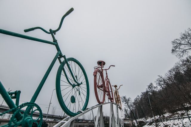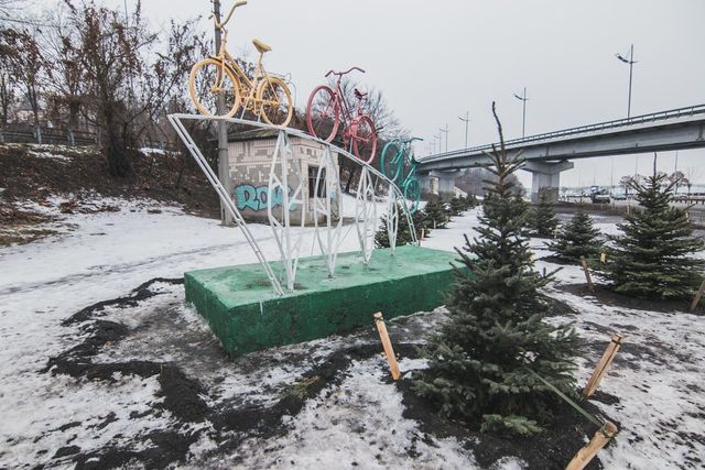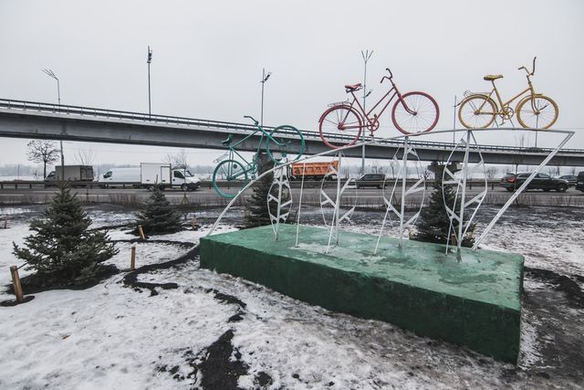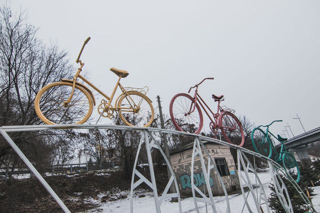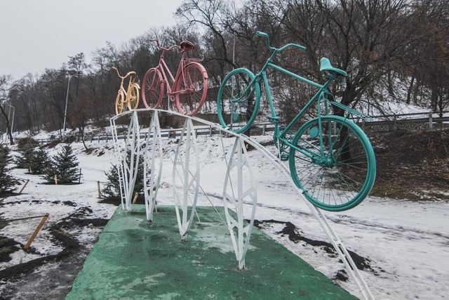 В Печерском районе украинской столицы появилась новая необычная достопримечательность – инсталляция из трех старых велосипедов, покрашенных в разные цвета. Разместился арт-объект под названием «Велосипедная семья» в сквере на пересечении Парковой дороги с Набережной шоссе.