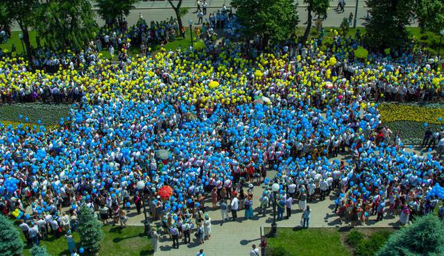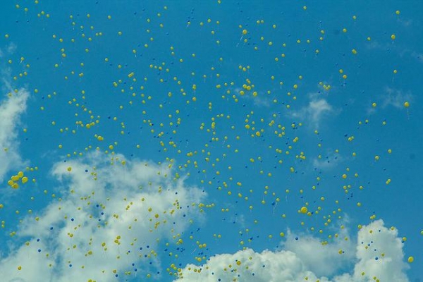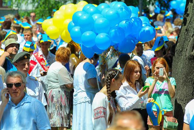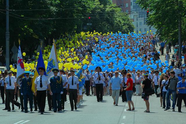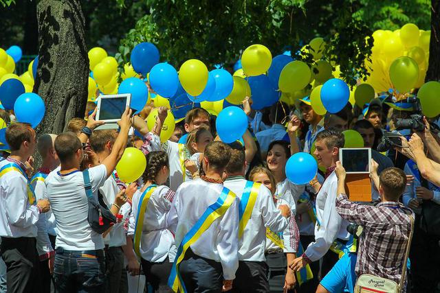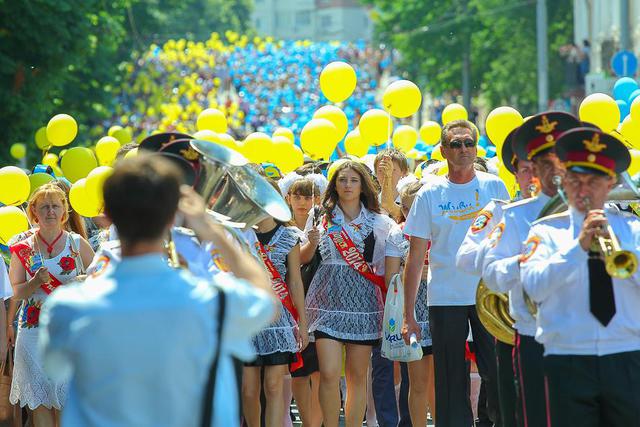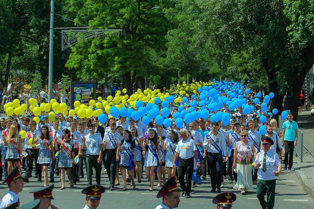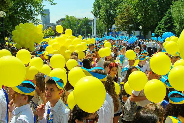 Вся Украина просто восхищается днепропетровскими выпускниками. Они в день своего последнего звонка прошлись по основному городскому проспекту к центральной площади Днепропетровска. В руках у ребят были голубые и желтые воздушные шарики. Их, после окончания мероприятия, выпустили в небо.