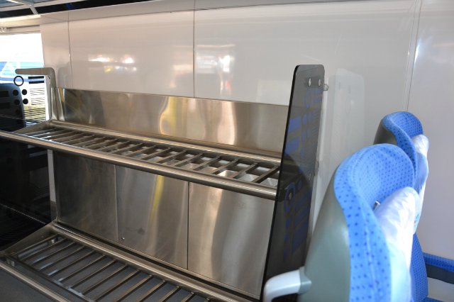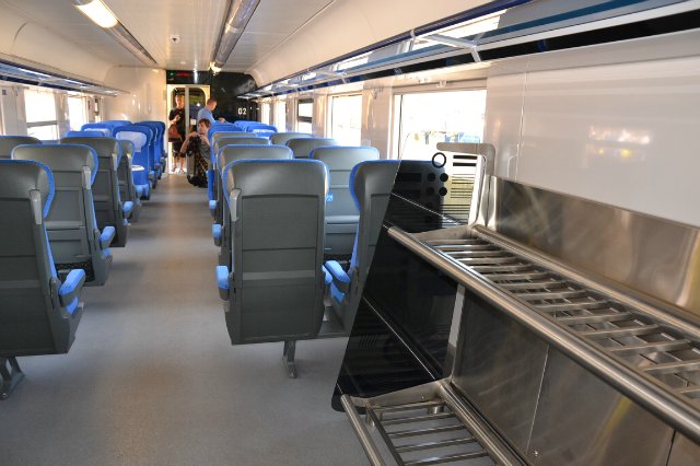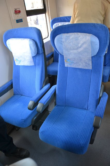 В «Тарпане» девять вагонов, из них два головных и тяговых. Вагоны для пассажиров двух классов. В тех, что предпочитают экономить, условия немного не такие удобные, как у пассажиров первого класса. Есть кондиционеры, стюарды. Пока еще есть проблемы с «ловлей» wi-fi, но это обещают исправить. Кроме того, можно при необходимости быстренько зарядить свои мобильники или ноуты, развесить вещи, дабы они не помялись, заказать ланч.