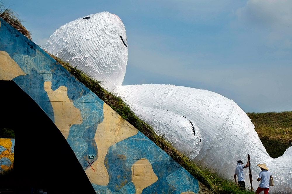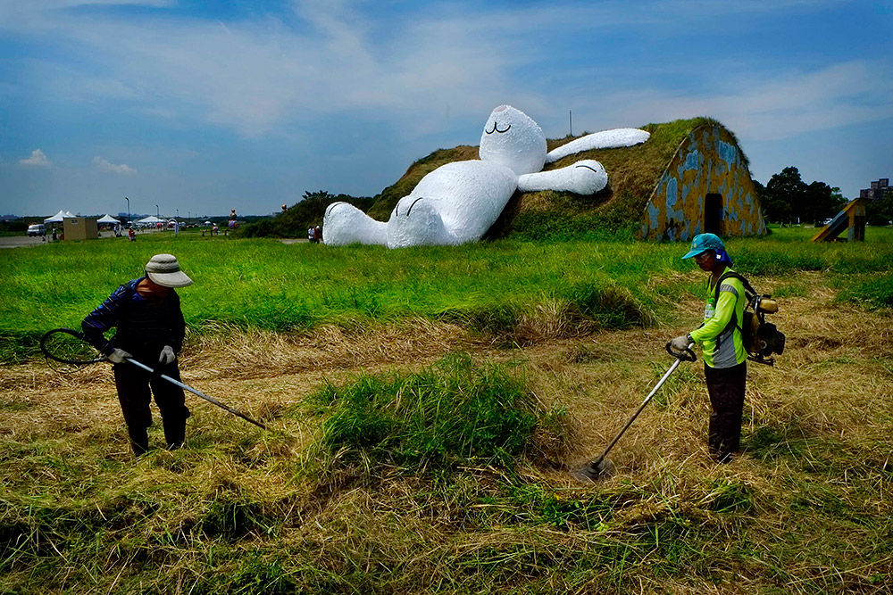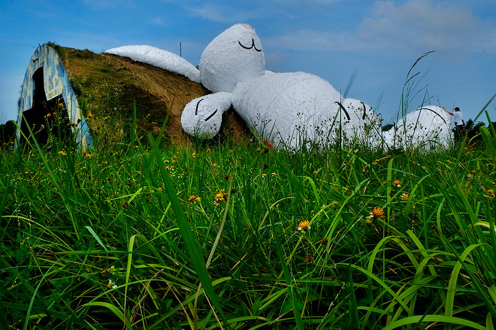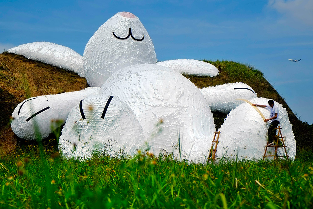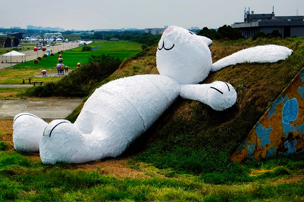 Фигура кролика величиной в целых двадцать пять метров сделана из водоупорной бумаги, пенопласта и древесины. Кролик теперь будет экспонатом одного из Фестивалей ландшафтного дизайна. Которому суждено открыться через неделю. К слову, это уже совсем не первое творение Хофмана. Так в прошлом году несколько миллионов туристов на Тайване любовались на его огромного утенка из резины. Ранее он уложил позагорать гигантского зайца на берег водоема.