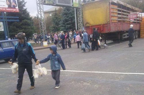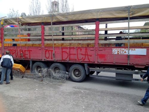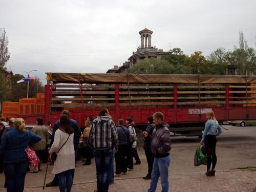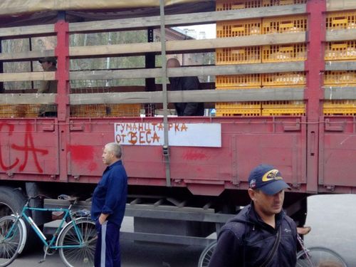 На борту этой машины было написано «гуманитарная помощь», а также «привет от Беса», несмотря на то, что красная надпись выглядела достаточно зловеще, горожане активно разбирали живую гуманитарку. Отметим, что именно так зовут Игоря Безлера, командира так называемых «ополченцев» в Горловке.