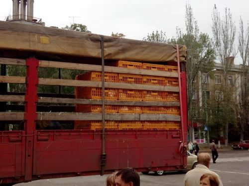 Вчера в Горловке раздавали живых куриц. На центральную площадь пригнали большую фуру, набитую клетками, в которых находились живые куры.