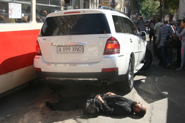 В столице Украины эффектную блондинку заблокировали прямо на дороге возмущенные граждане. Дело в том, что дамочка неправильно припарковалась. Свой шикарный «мерс» она поставила на пути у трамвая №15. Он из-за этой досадной помехи простоял около сорока минут, ожидая девушку. Когда она увидела, что наделала, то хотела по-быстрому уехать, но народ разбушевался, и преградил путь. Так, какой-то священник лег под колеса. А женщины с мужьями кидались на капот.