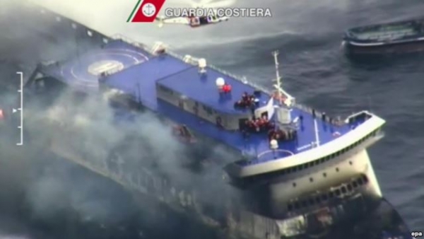 Вчера вечером итальянские власти заявили, что все пассажиры эвакуированы с парома, поврежденного пожаром. 427 человек с борта перевозили на вертолетах. Осложняли работу погодные условия.