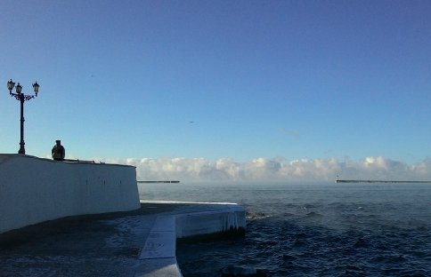 В Севастополе дымка укрыла Черное море в Рождество, а вчера такое же явление наблюдали в Феодосии. Крымчане тут же стали выкладывать видео необычного явления в сеть, но вместе с тем можно встретить и массу впечатляющих фотоснимков. В Севастополе, например, горожане и гости города поспешили на Графскую пристань, а также на Приморский бульвар, откуда можно было сделать фото морских пейзажей, где, естественно, особое внимание привлекает дымчатая пелена, укрывающая водную гладь.
