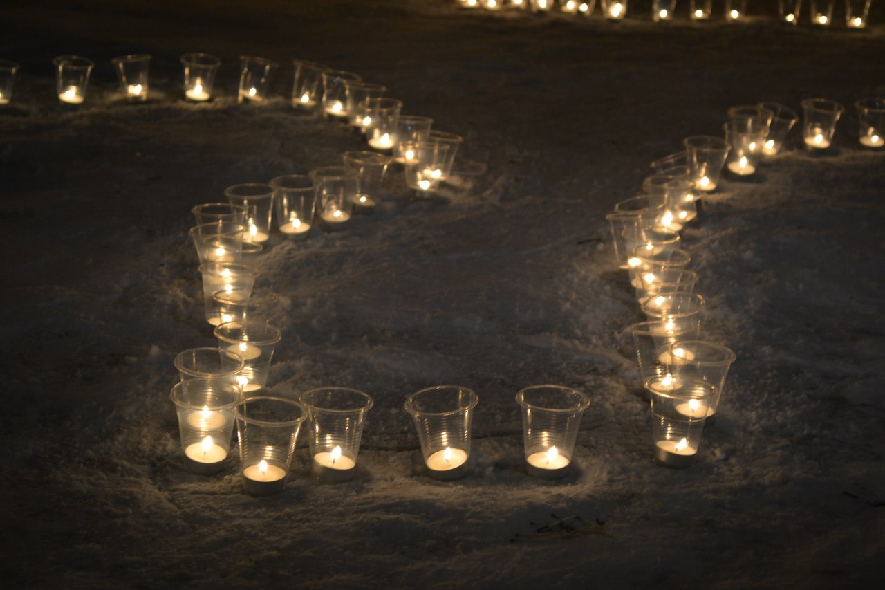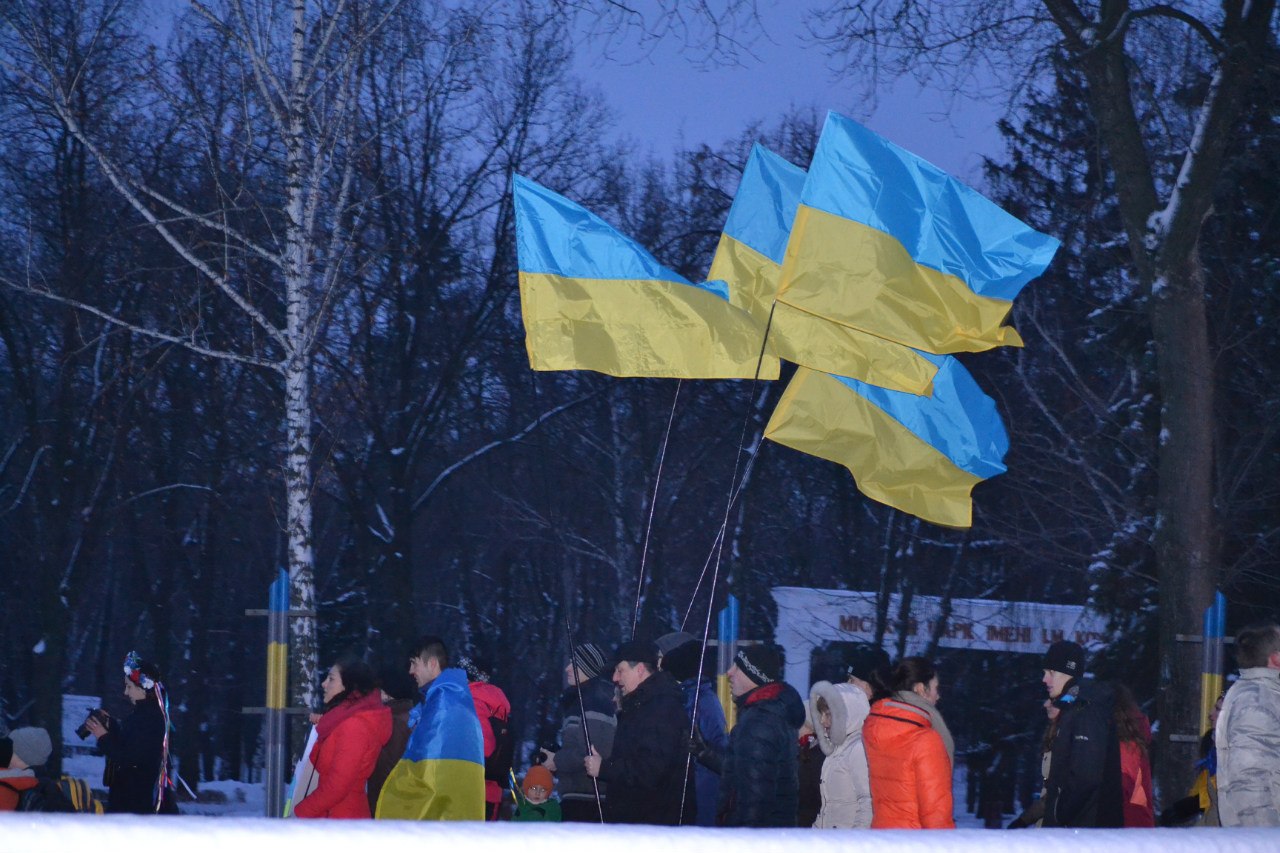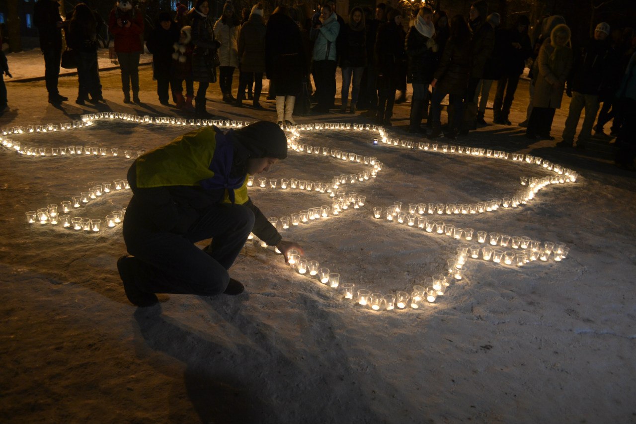 А вечером возле памятника Тарасу Шевченко, на нарисованной на снегу карте Украины, сумчане зажгли маленькие свечи. На миг притихли, вспоминая героев-соотечественников, которые уже погибли в АТО, а также жертв среди местных жителей на востоке страны. Затем, спели гимн, сказали несколько слов об организации мероприятия и важности таких событий в сложившейся ситуации.