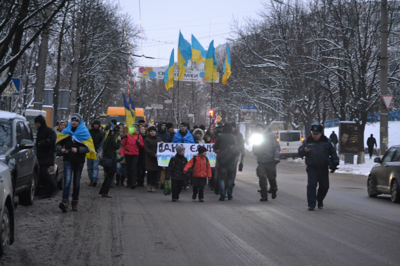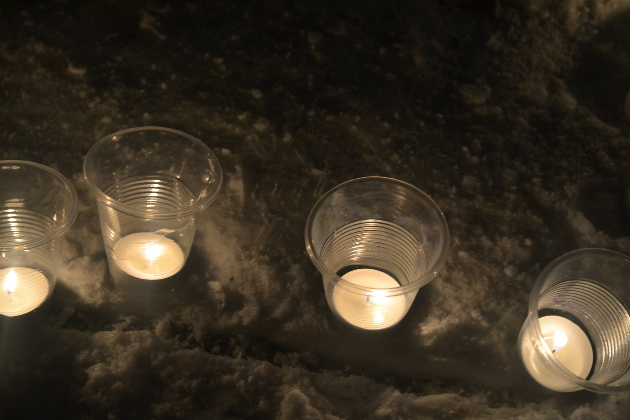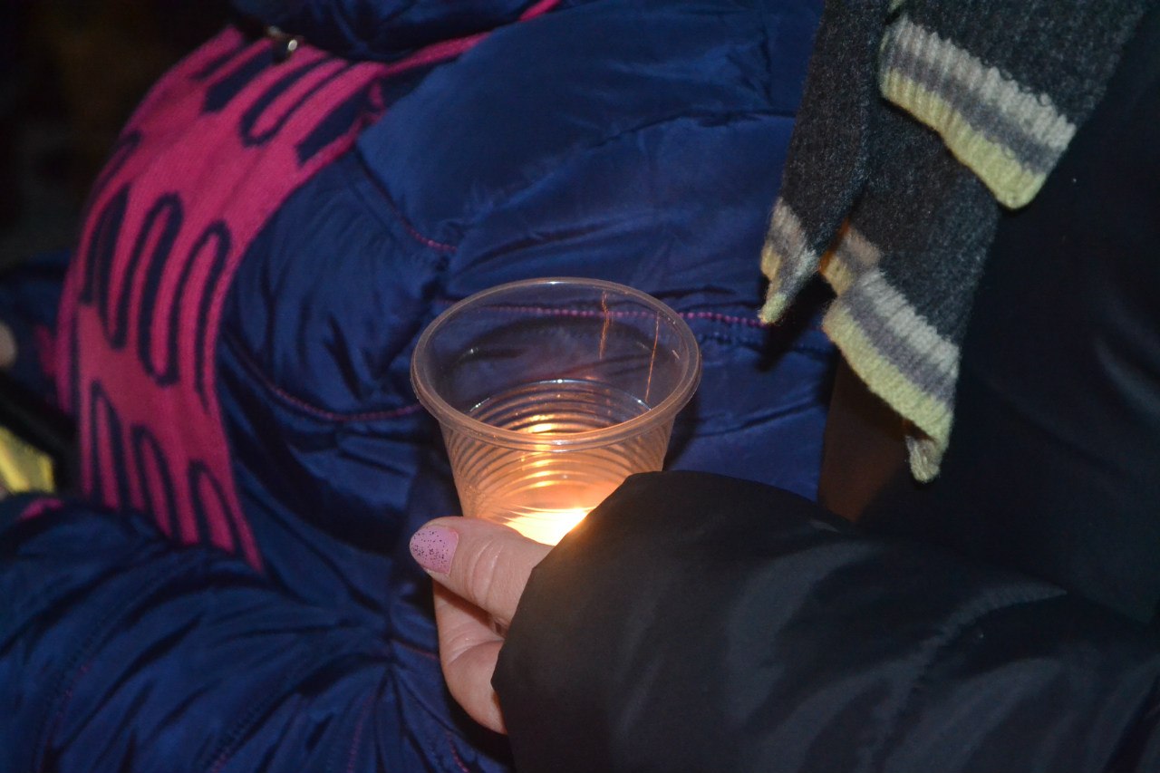 А вечером возле памятника Тарасу Шевченко, на нарисованной на снегу карте Украины, сумчане зажгли маленькие свечи. На миг притихли, вспоминая героев-соотечественников, которые уже погибли в АТО, а также жертв среди местных жителей на востоке страны. Затем, спели гимн, сказали несколько слов об организации мероприятия и важности таких событий в сложившейся ситуации.