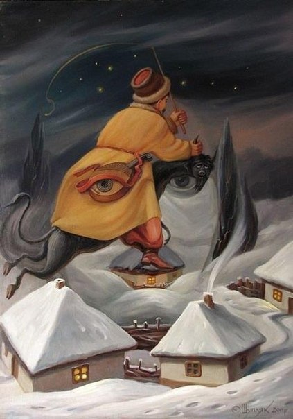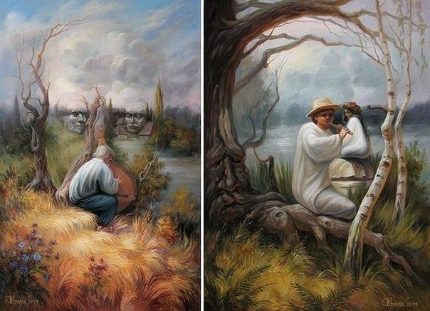 Очень интересные оптические иллюзии создает Олег Шупляк, украинский художник, который родом из Тернопольской области. Картины у него имеют двойной смысл. С одной стороны, это простые деревенские или городские пейзажи. Но если глянуть внимательнее, задержав на рисунке взгляд, то ясно, что в деревьях, домах, облаках замаскированы портреты известных людей, таких, как Франко, Шевченко, Суворов и Гоголь. Работы у Шупляка необычные и красивые.