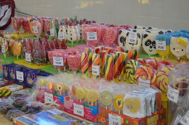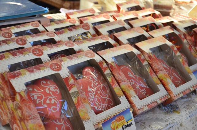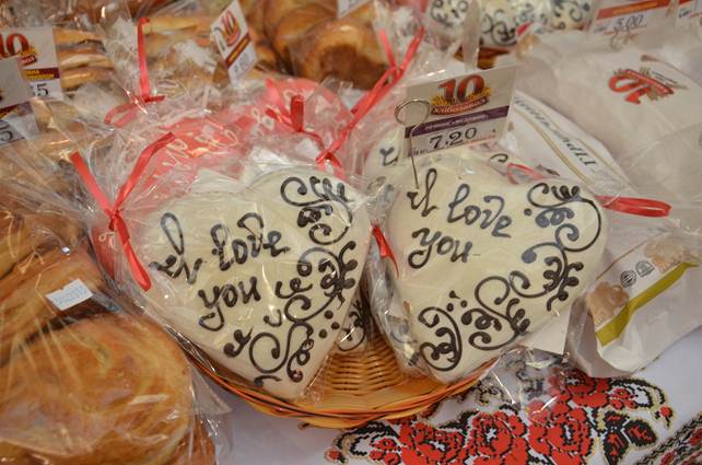 В Днепропетровске была сегодня торжественно открыта праздничная ярмарка, посвященная Дню влюбленных. На ярмарке можно, в основном, купить что-нибудь вкусненькое. Есть тут невероятные торты и яркие пирожные, разноцветные конфеты и сладкие пряники, ароматные кексы, разнообразные леденцы и иные лакомства, оформляемые кондитерами в самой сумасшедшей цветовой гамме, делаемые в форме сердец, разрисованные и подписанные всяческой романтичной чепухой.