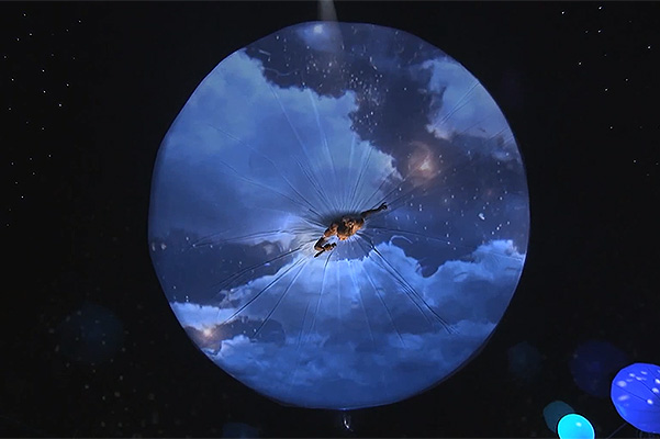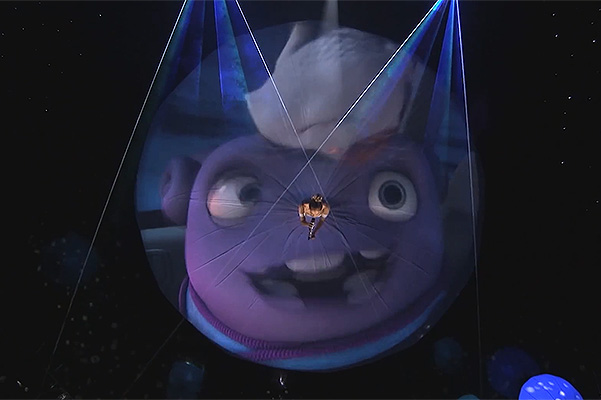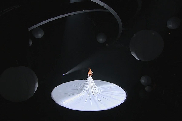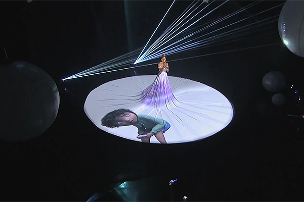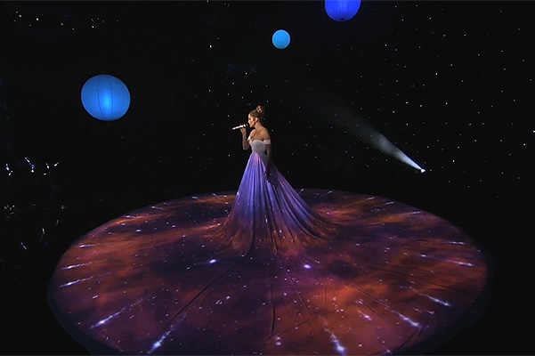 Пока певица исполняла песню Feel the Light, платье по очереди «показывало» то звездное небо, то мультипликационные кадры, то иные красочные проекции.