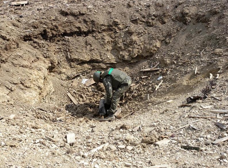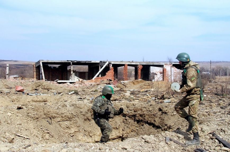 Так представители минно-поискового подразделения ВСУ зачищают от различных взрывоопасных предметов один населенный пункт, который расположен совсем недалеко от Дебальцево и Артемовска. Именно там, в ходе, боев взорвался склад, на котором были артиллерийские боеприпасы.