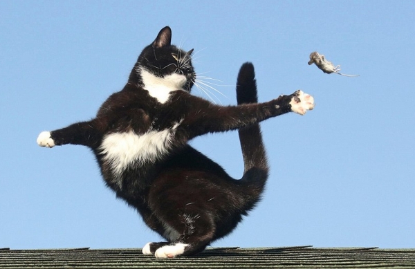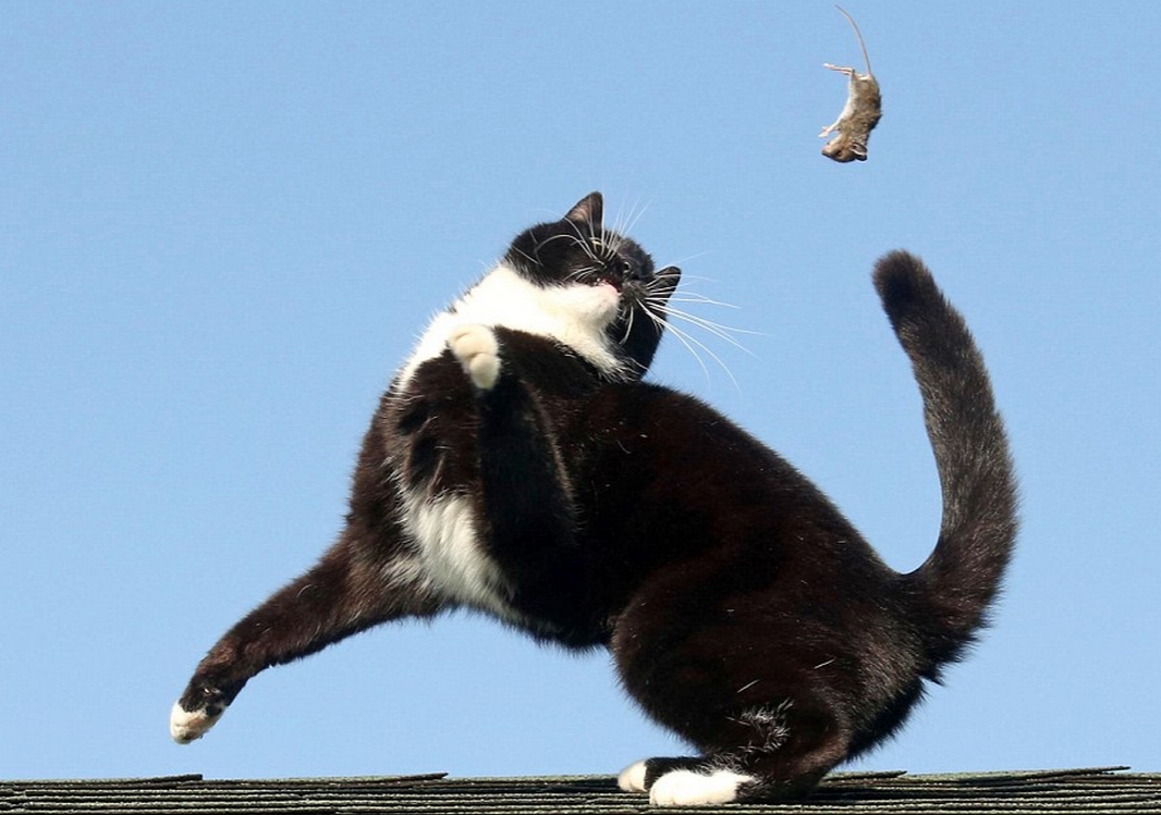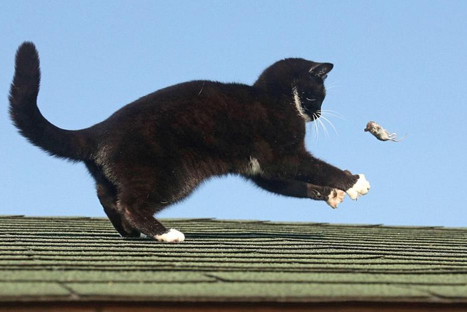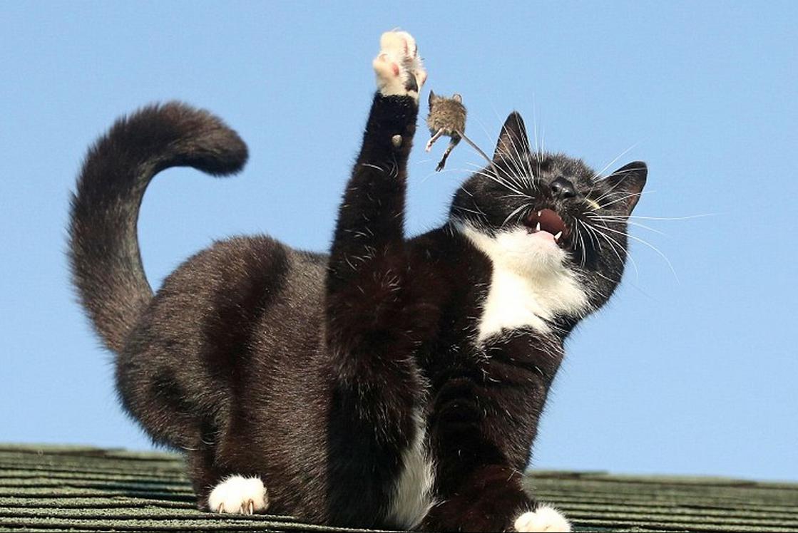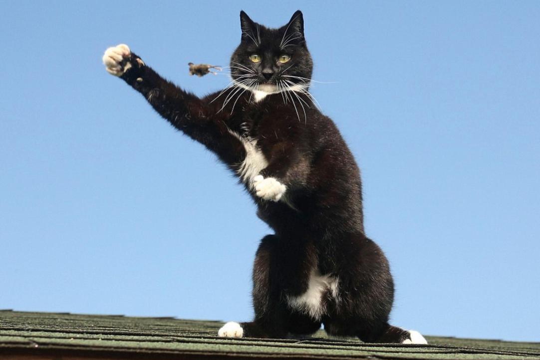 Джейсон Брайант был привлечен непонятной возней на крыше своего сарая. Кот Могги там чем-то шумел, присмотревшись, хозяин понял, что питомец поймал мышку и забавляется с ней, играя. Его кот – довольно умелый охотник на грызунов. Правда, охотится Могги, как правило, по ночам, а утром приносит трофеи. Как именно кот это делает при свете дня, хозяину еще ни разу не приходилось засекать. К счастью, под рукой была фотокамера. Снимки Джейсон разместил в соцсетях. Теперь Могги прославился. А мышь он съел…
