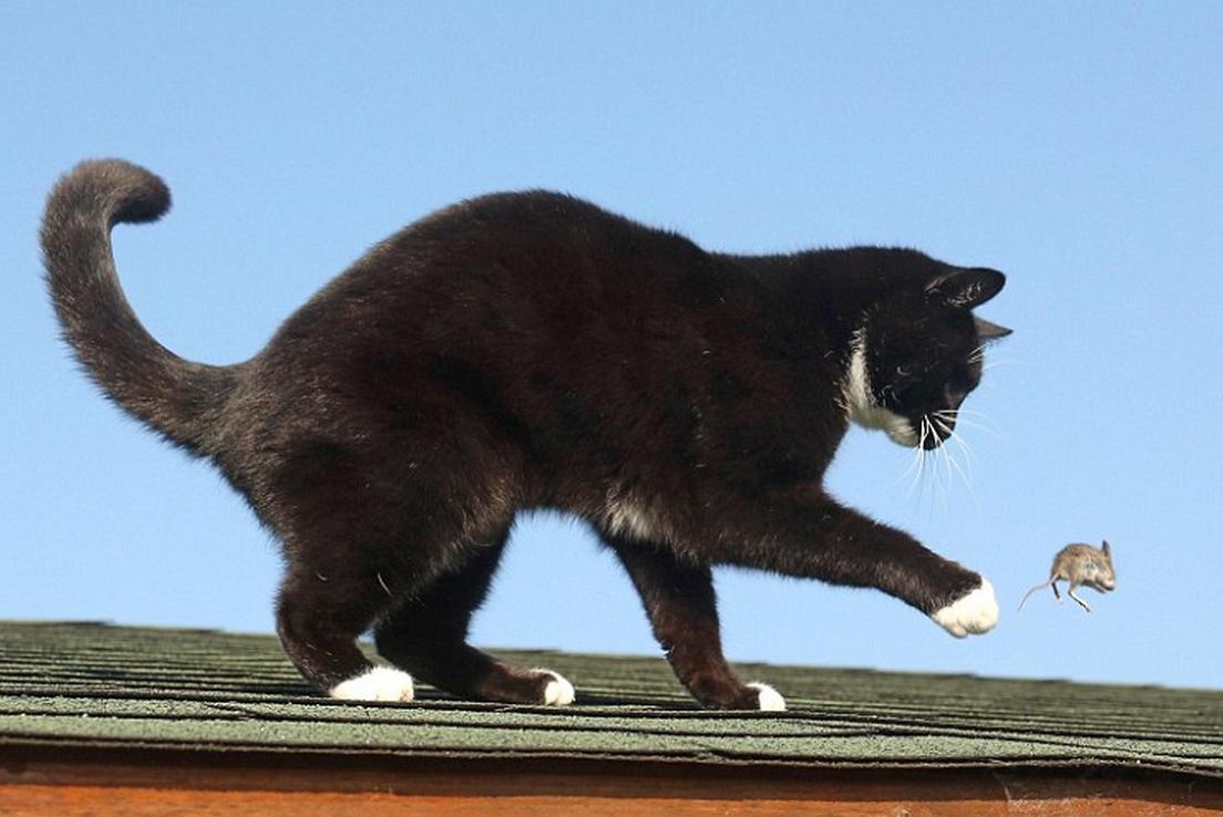 На одной крыше в Санбури (Британия) кот играл с мышкой. По мнению хозяина, который и сделал эти фото, борьба животных напоминает кадры из известного мультфильма, в котором Том ловит Джерри.