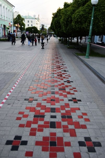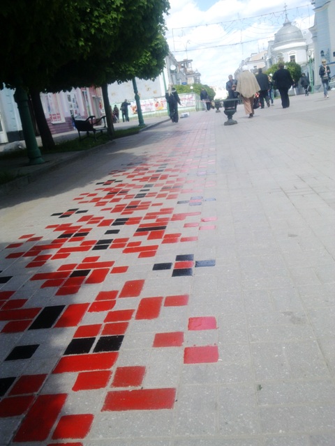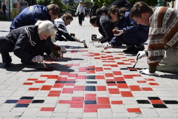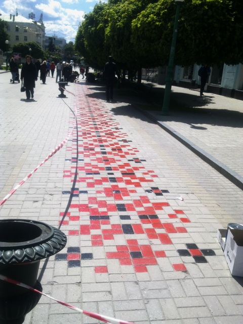 В Сумах решили ко Дню вышиванки нарисовать самый длинный узор на тротуарной плитке. Так третий день организаторы, вместе со всеми желающими, разукрашивают дорожку, и приглашают поучаствовать прохожих. С запасом купили краску – черную и красную, сто пятьдесят литров. Кроме того, заранее подготовили трафарет. Поэтому рисовать могут даже те, кто не уверен в своих художественных способностях, могут почувствовать себя причастными.