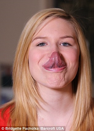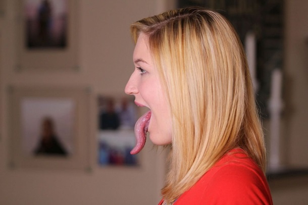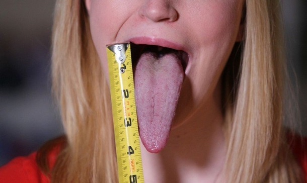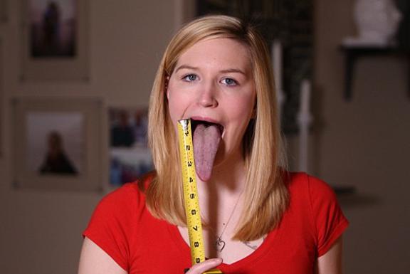 Известно, что длина язычка девушки более десяти сантиметров. И этого вполне достаточно для касания своего носа, локтя руки, подбородка, и даже собственного глаза.