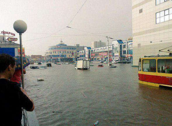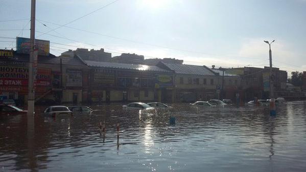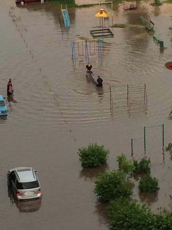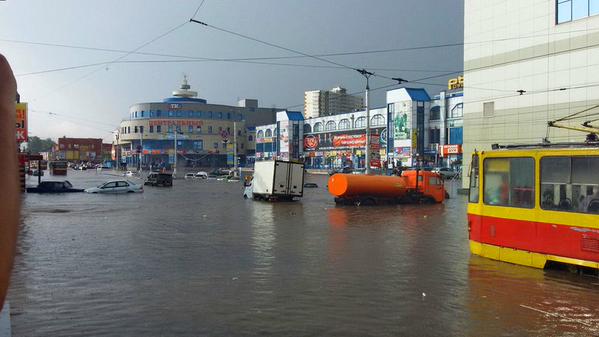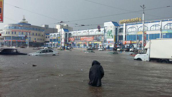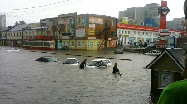 Курск (РФ) затопило сегодня. На город вдруг обрушился невероятно мощный ливень, да такой, что просто не смогли справиться местные ливневки со сливами в канализационную систему. Курские улицы оказались не готовы к буйству водной стихии. Судя по кадрам из интернета, практически плыть пришлось пешеходам и многочисленным автомобилям, застигнутым ливнем врасплох. В отдельных районах дождевая вода умудрилась достигнуть аж до крыш авто. Да и трамваи оказались затопленными почти до середины своих боков.