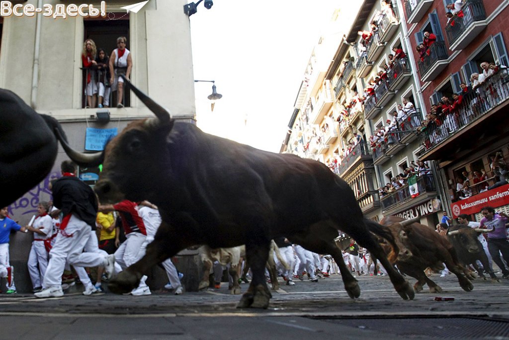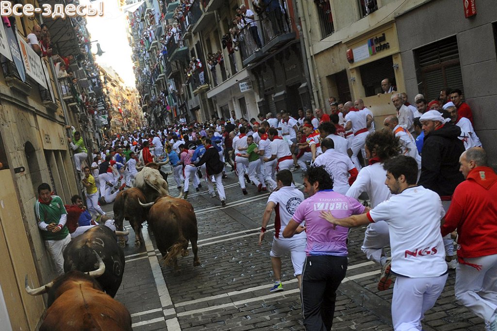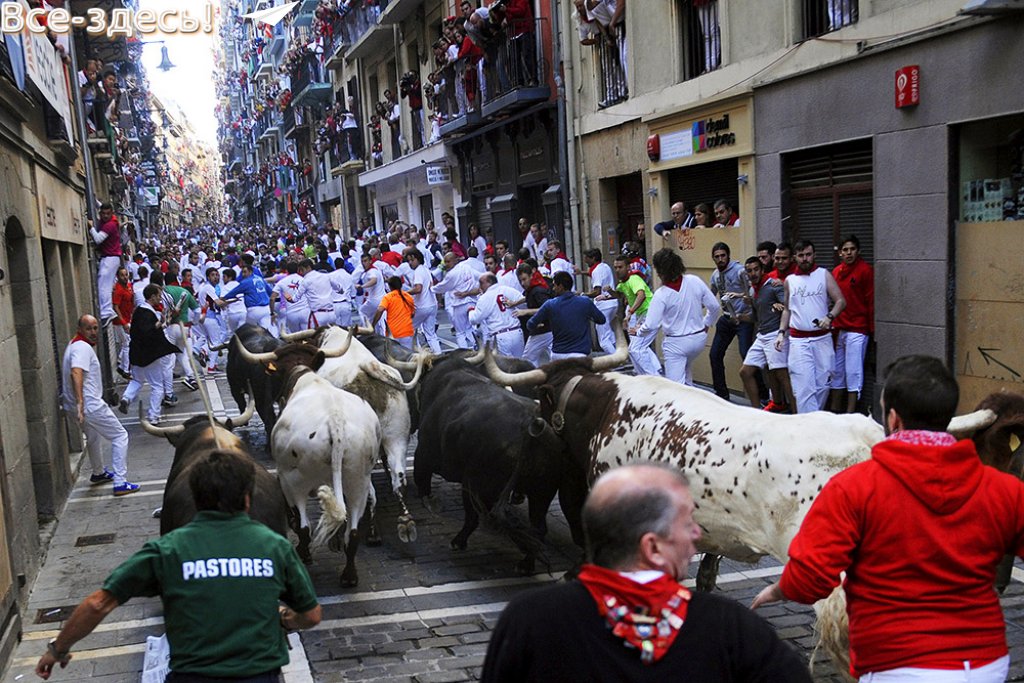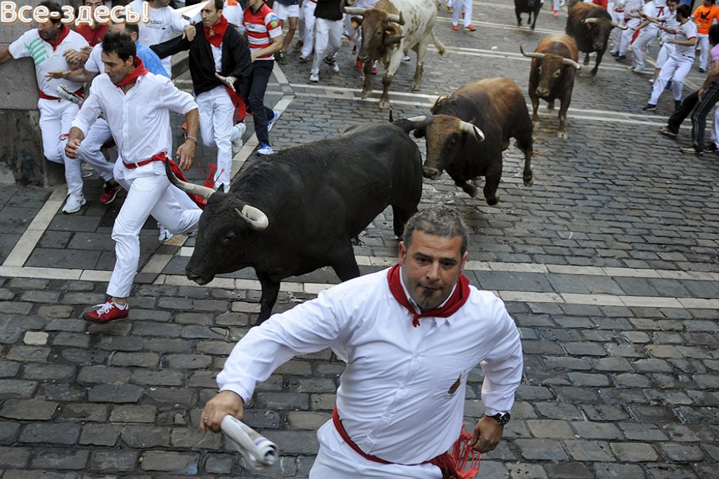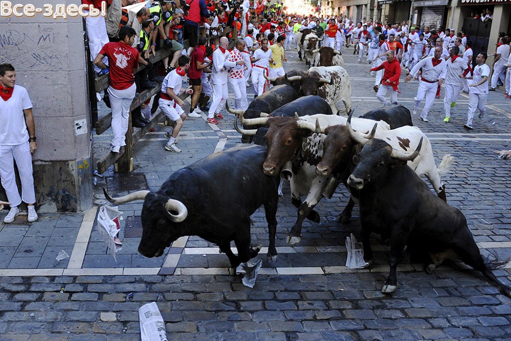 В небольшой городок каждый год приезжают ради него тысячи туристов. Праздные зеваки и любители пощекотать себе нервы острыми ощущениями искренне надеются на статую св. Фермина. Который, по приданию, обязан бегунов уберечь от разъяренных быков. К восьми утра дается старт энсьерро – забегу быков. Целая толпа убегает по узеньким улочкам от двенадцати разъяренных животных. У них есть минутки три на то, чтобы преодолеть дистанцию в восемьсот метров. Известно, что сумасшедший забег оканчивается уже после того, как уставшие животные выходят на арену, там вечером проводится коррида. На таких забегах часто случаются травмы, иногда их омрачают даже смертельные случаи. С начала 1911 года уже погибло пятнадцать человек.