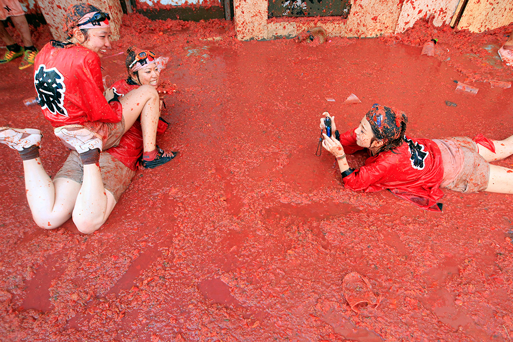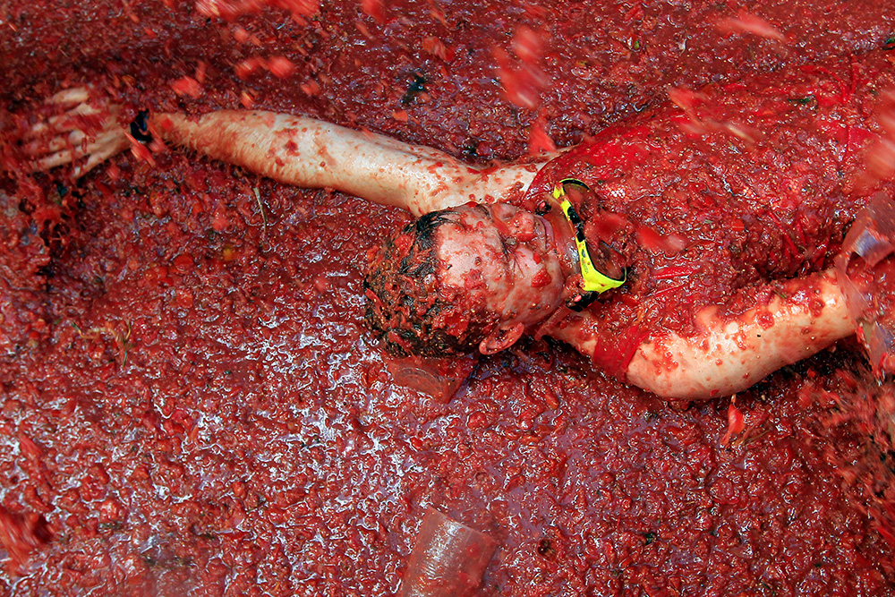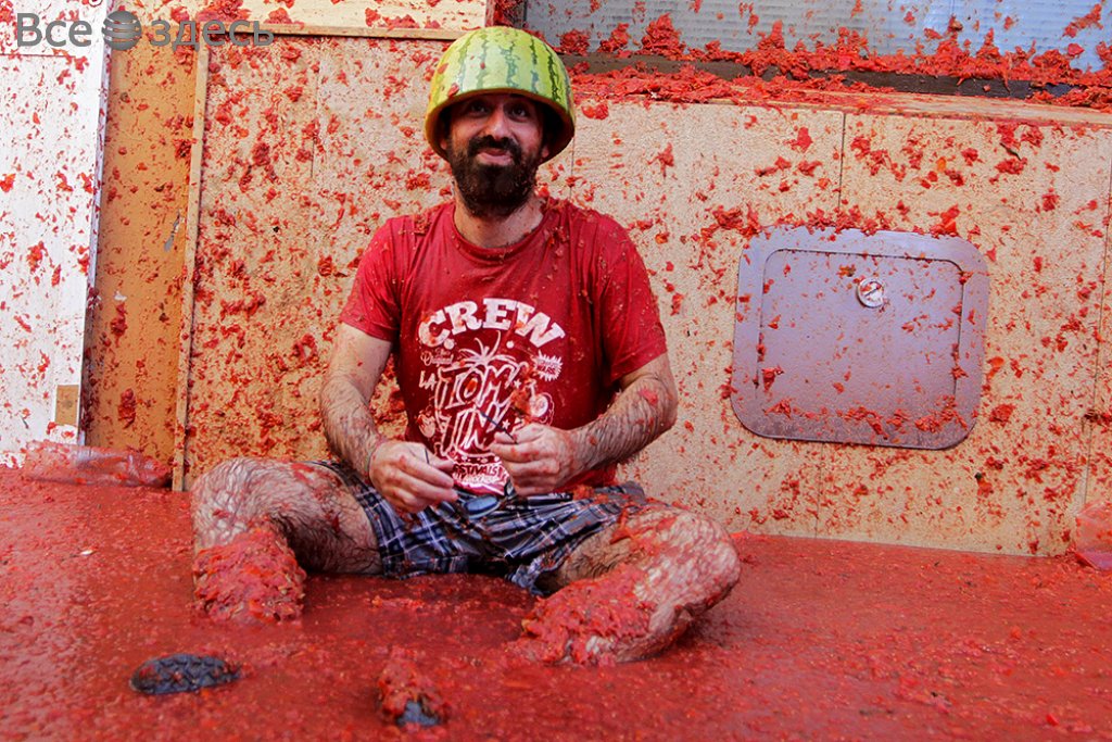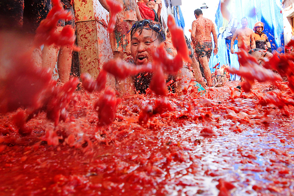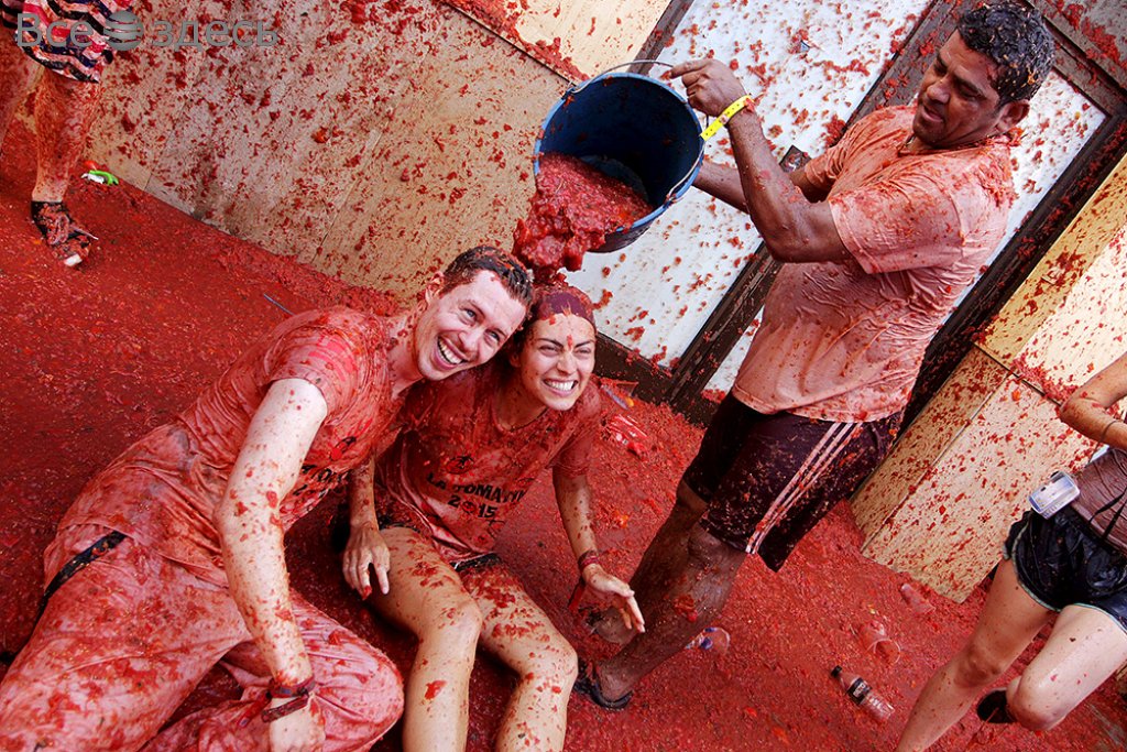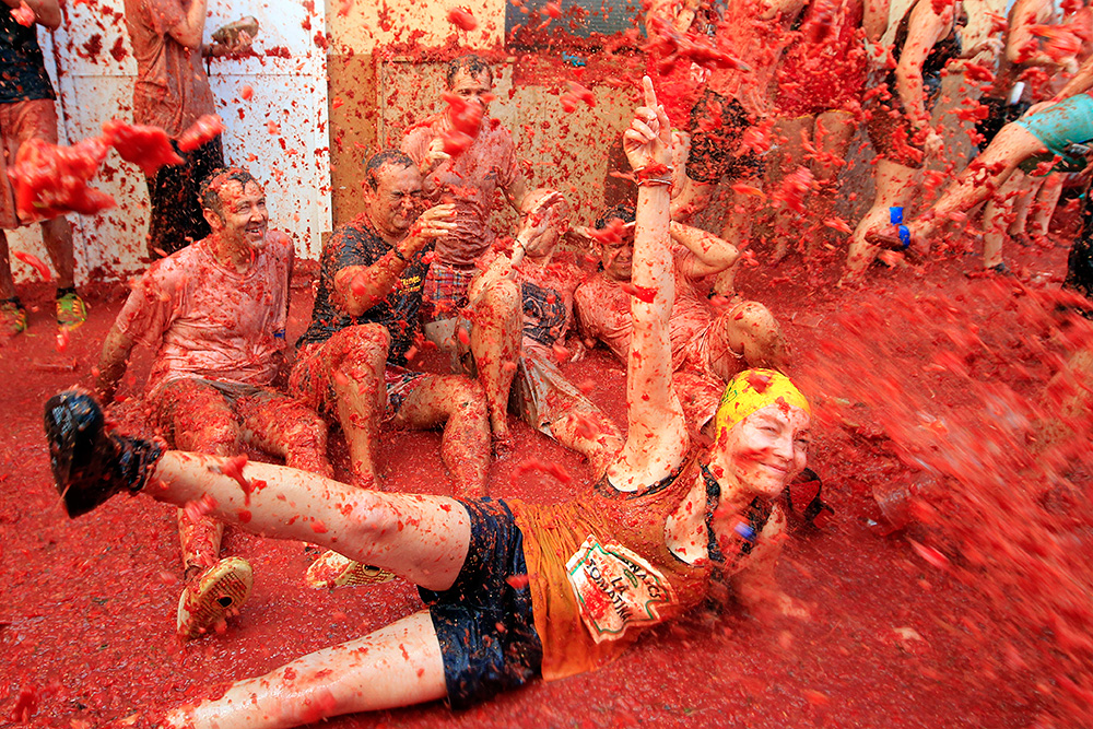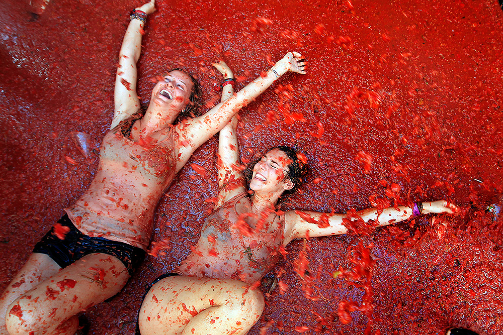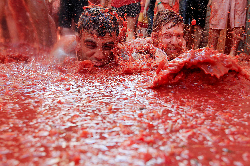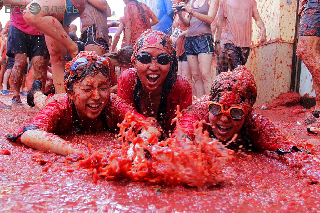 Испанцы обожают уничтожать помидоры. Именно для этого был придуман удивительный процесс. Уже семьдесят лет подряд жители одного замечательного испанского местечка - Буньоль - организуют фестиваль под названием «Томатина», чтобы бросаться, давить, поливать друг друга, плавать, лежать, сидеть, фотографироваться, есть исключительно томаты. Около сорока пяти тысяч обожающих томаты человек занимались всем этим на днях в провинции Валенсия. Томатная битва длилась всего час, но, за это ограниченное время отчаянным испанцам вместе с многочисленными туристами удалось уничтожить сорок тонн помидоров, а это приблизительно сотня с половиной тысяч плодов. Традиционно фестиваль длится семь дней, а после Буньоля такие помидорные бои проходят в иных городах Испании.