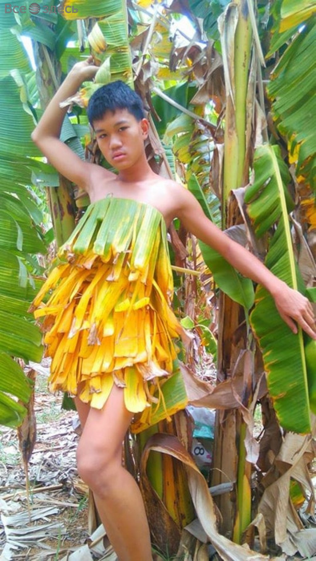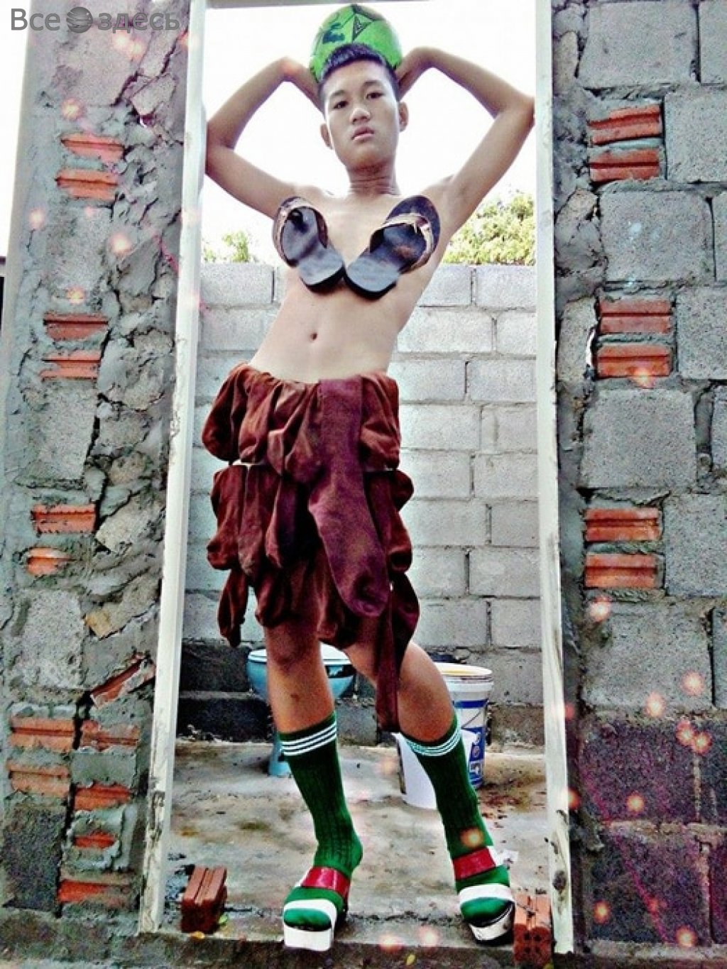 Пятнадцатилетний подросток показывает, как можно ну очень стильно выглядеть, если у тебя совсем нет денег. Помогут такие аксессуары: чуть банановых листьев, шифер, очки, картошка, отрезы ткани, шлепанцы, вешалки, старые корзины. И практически все королевы сцены и подиума аплодируют вам стоя, представители СМИ торопятся на интервью.