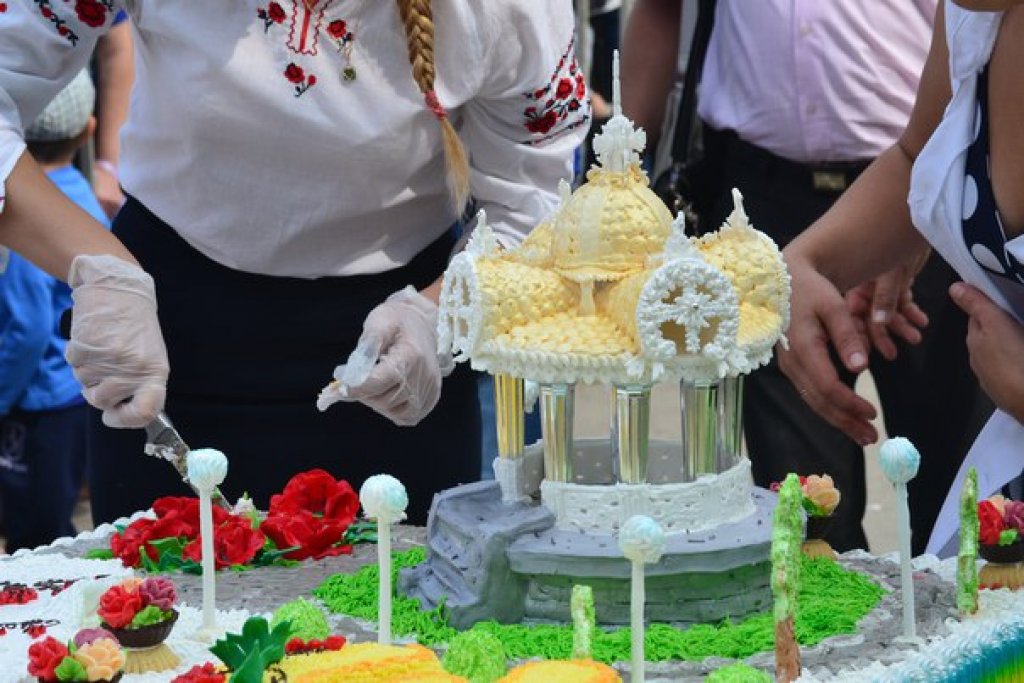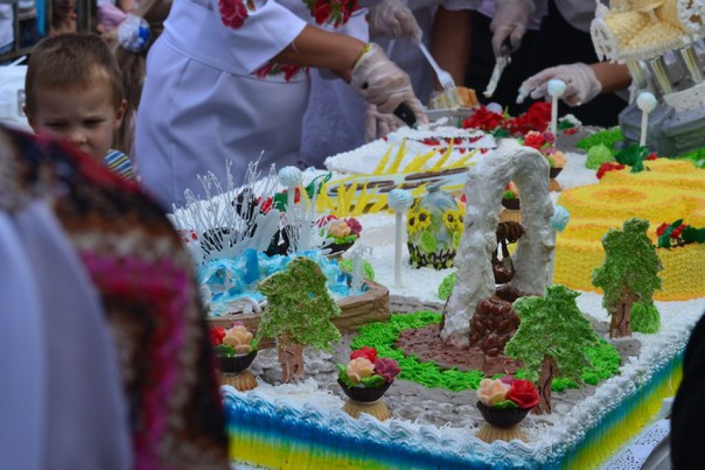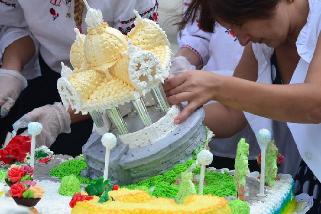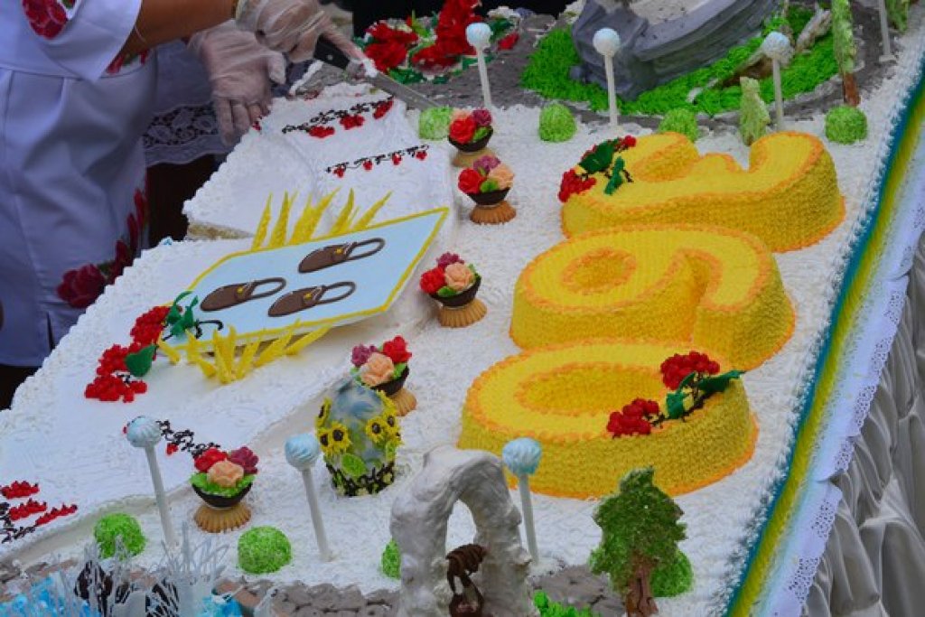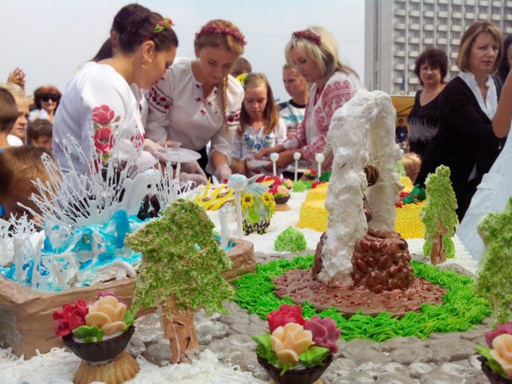 А еще сумчане сегодня съели свой город. Получилось это быстро, организовано и культурно. Без давки, лопат и активного дележа. Прекрасный пятидесятикилограммовый торт, который с любовью испекли для сумчан кондитеры предприятия «Сумська поляниця», представлял собой ключевые символы города.