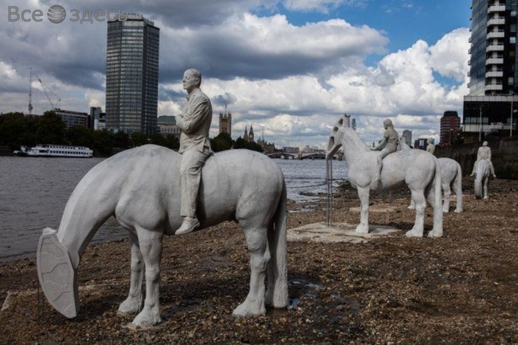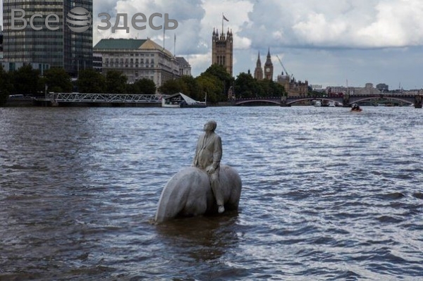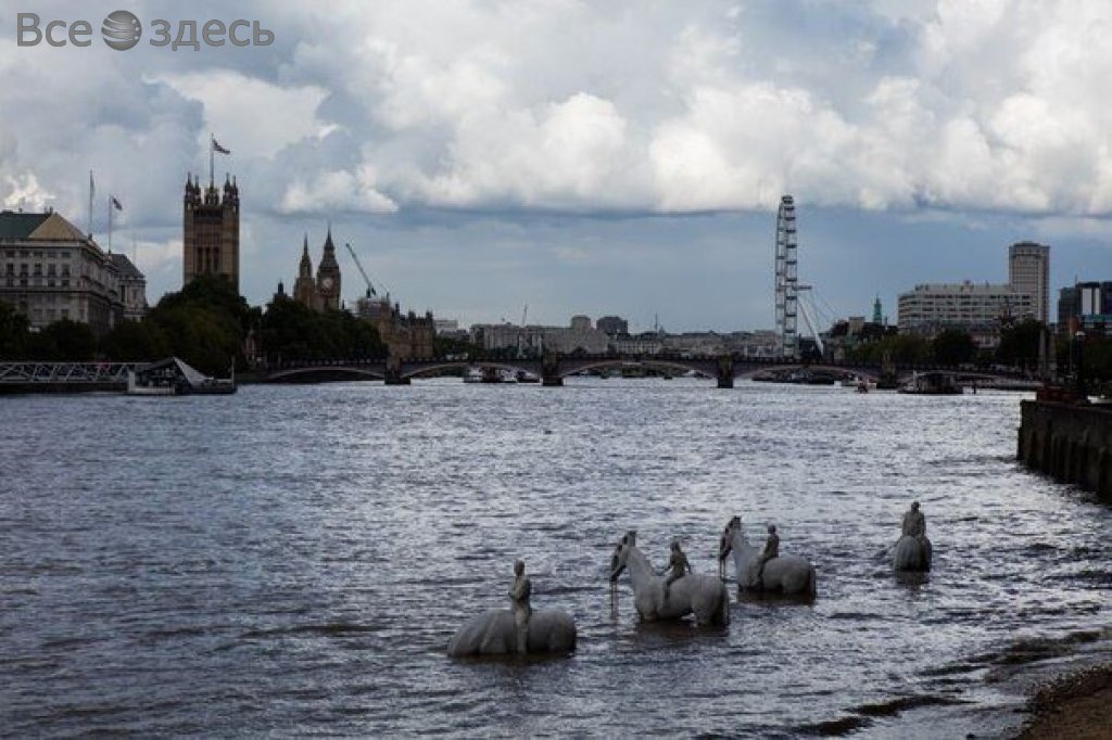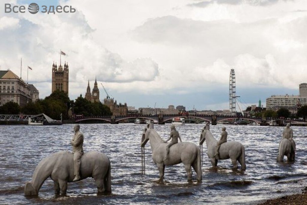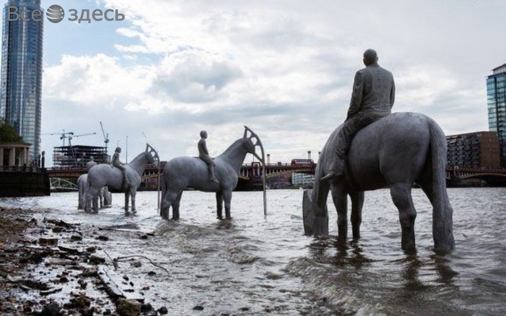 Джейсон Тейлор, известный скульптор и художник, прямо на дне Темзы установил шикарную инсталляцию, которая имеет общее название – «всадники промышленного апокалипсиса». Скульптуры два раза, прямо во время речного отлива, появляются прямо перед горожанами и удивленными туристами. Как говорит Тейлор, своей оригинальной работой он должен подвигнуть людей подумать над теми климатическими изменениями, которые вызываются их же деятельностью и о том, что с планетой совершает цивилизация современности.