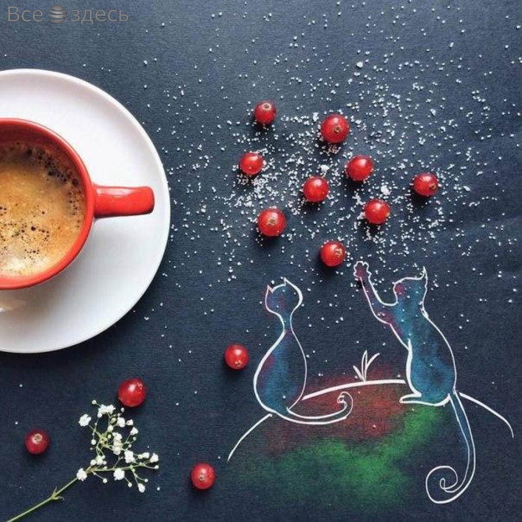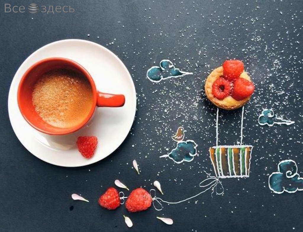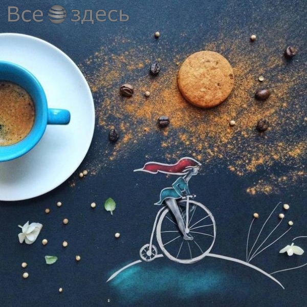 Синция Болонези свои работы создает прямо во время завтрака. Получилось это так: художница-иллюстратор один раз поставила свою чашку с кофе на черный холст. Тут же лежало небольшое печение. Смотрелось на рабочем холсте это очень здорово. И тут творческий человек понял, что этому утреннему натюрморту очень не хватает нескольких рисованных линий. Она их добавила, сделала несколько фотографий. Так начался этот оригинальный проект. Который красив, весьма элегантен и, при этом, невероятно аппетитен. После просмотра данной фотоновости от ВсеЗдесь многие уже идут за чашечкой кофе, признайтесь!