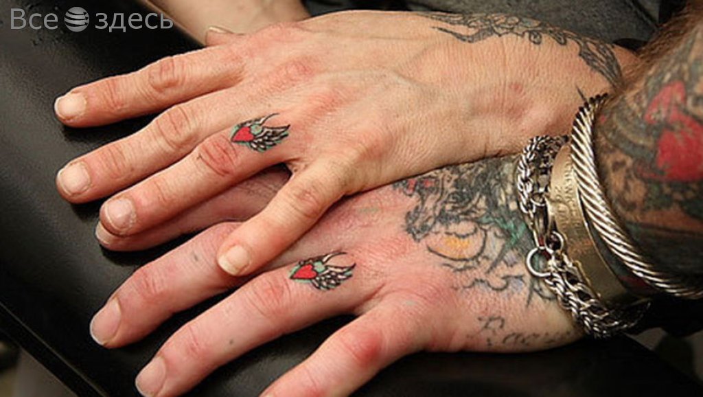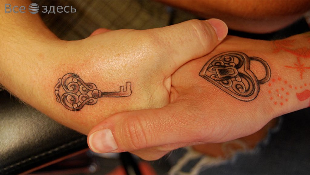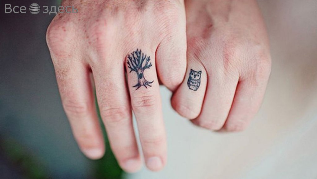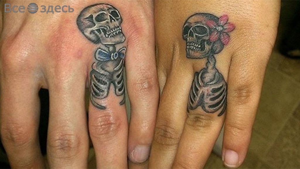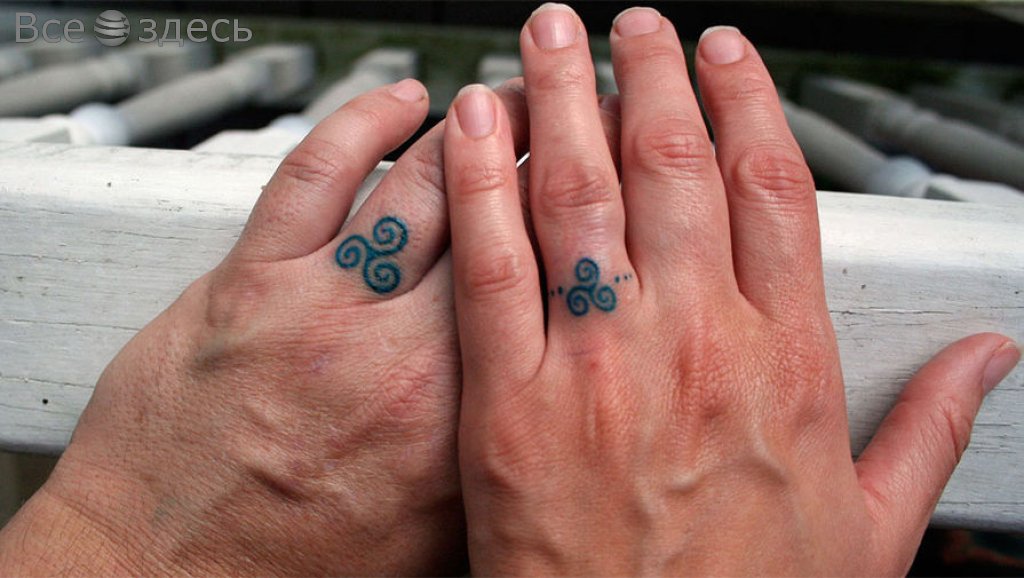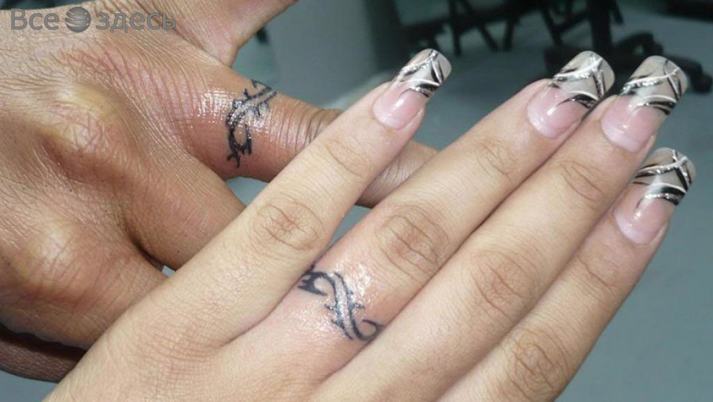 Можно не переживать, есть ли на пальце у второй половины обручальное кольцо сегодня, либо же он забыл его надеть, зачем-то снял, совсем выкинул в ходе ссоры, спрятал на время отпуска, потерял на работе. В моду входят татуировки свадебные. Так супруги получают своеобразную имитацию кольца или рисунок, складывающийся в общую композицию, если супруги берутся за руки. Некоторые выбирают простейшие ключик и замочек, кто-то заморачивается, и наносит несколько фигурок из Тетриса, идеально подходящие одна другой, можно отдаться дизайнерам, и они выдумают нечто умилительно-безумное, в виде, к примеру, дерева с дуплом для совы, которая в нем живет. Такое кольцо можно «снять», только очень постаравшись, ведь окончательно сводить татуировку любой решится только уже после развода.