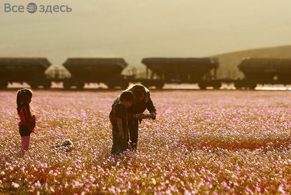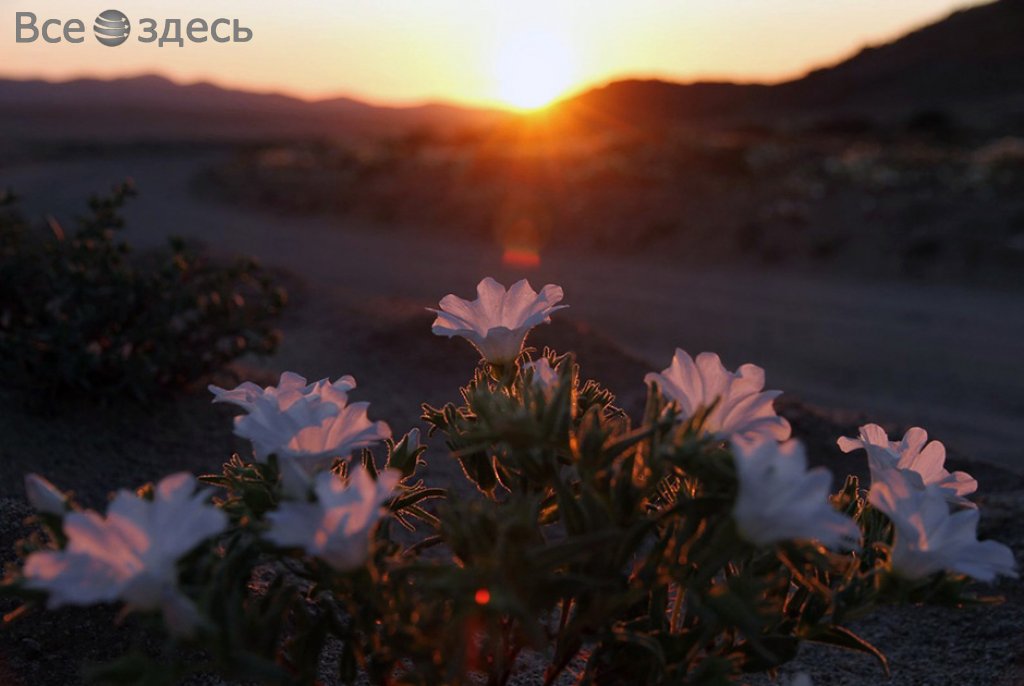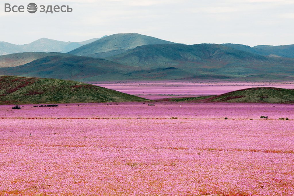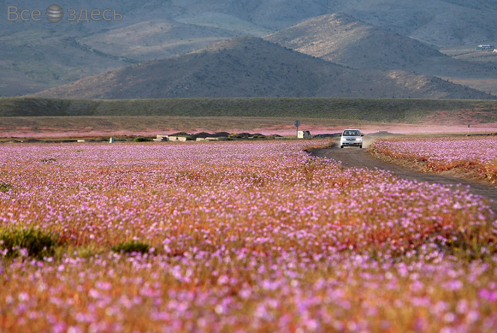 Пустыня Атакама, которая находится на побережье Чили, внезапно покрылась цветами. Это невероятное событие в мире природы случилось из-за феномена Эль-Ниньо, который грозит Северной Америке самыми опасными ураганами, сильнейшими наводнениями и внезапными оползнями. Вдруг самое засушливое место в одном из уголков планеты покрылось цветами второй раз за этот год.