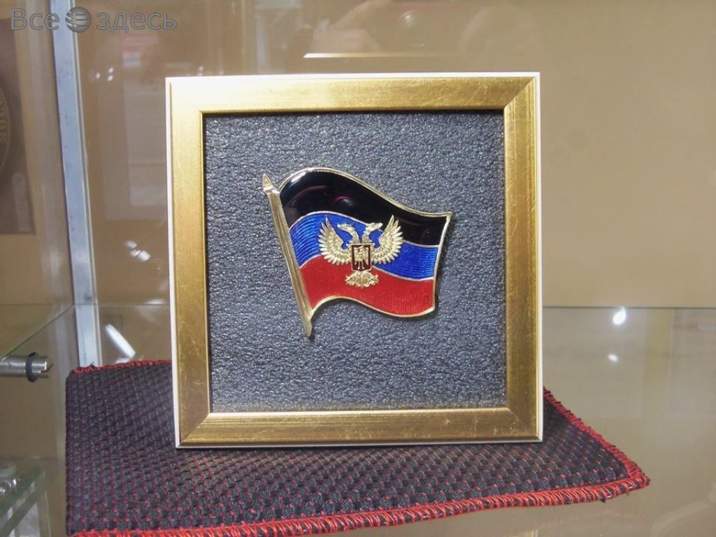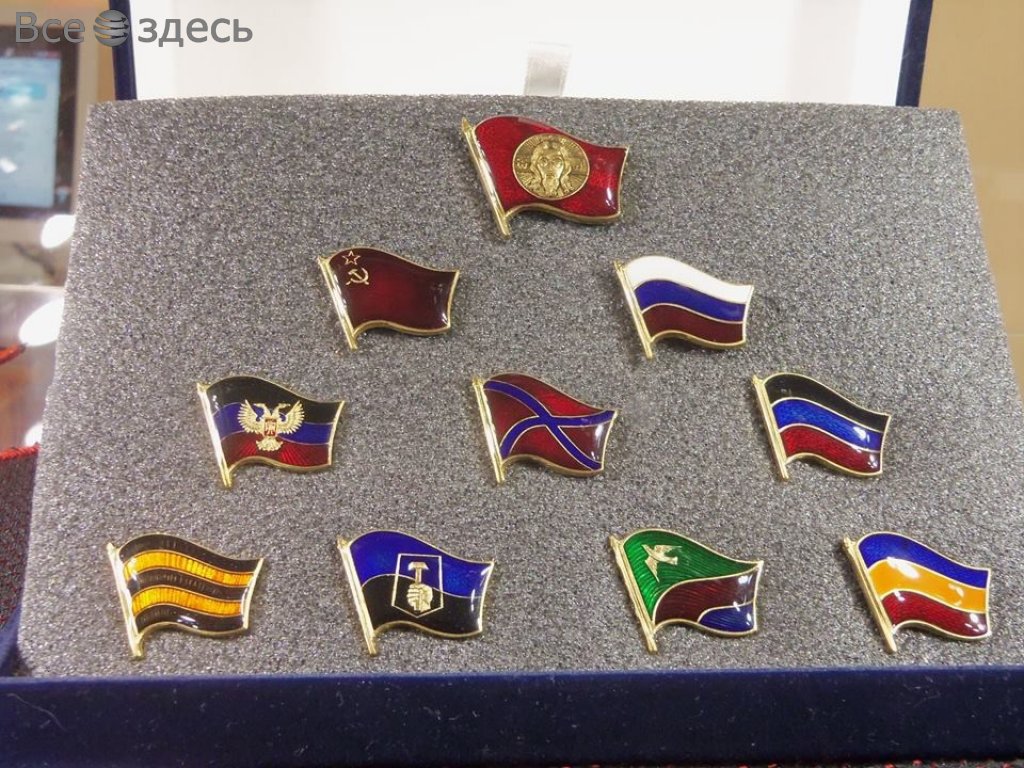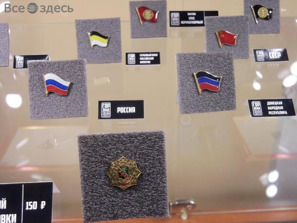 К примеру, можно купить себе значок боевика «ДНР» либо «Новороссии», флажок для автомобиля, ну или подвеску для цепочки, на которой выгравирована гордая надпись о хозяине «Жил в Горловке» и годы 2014-2015, видимо, передающая выдающуюся доблесть человека, пережившего боевые действия в оккупированном городе.