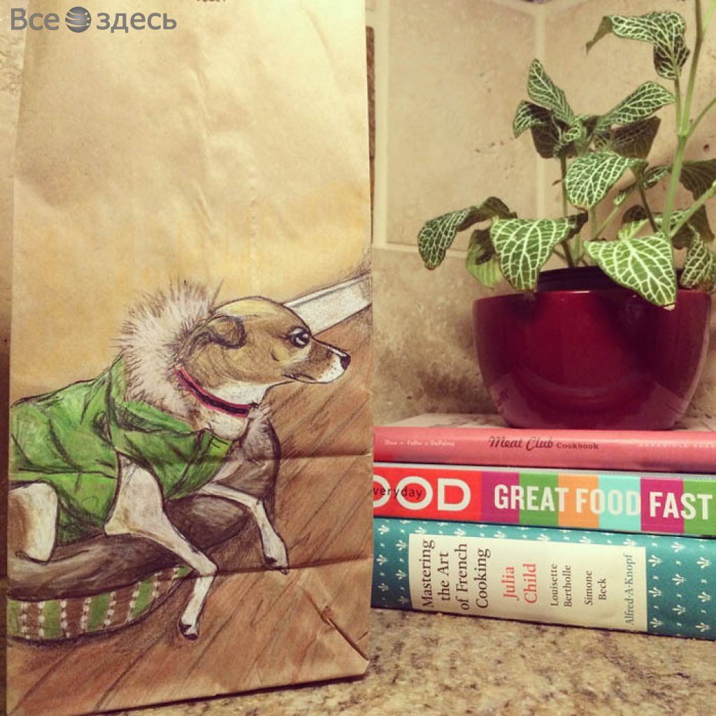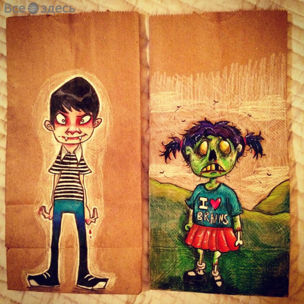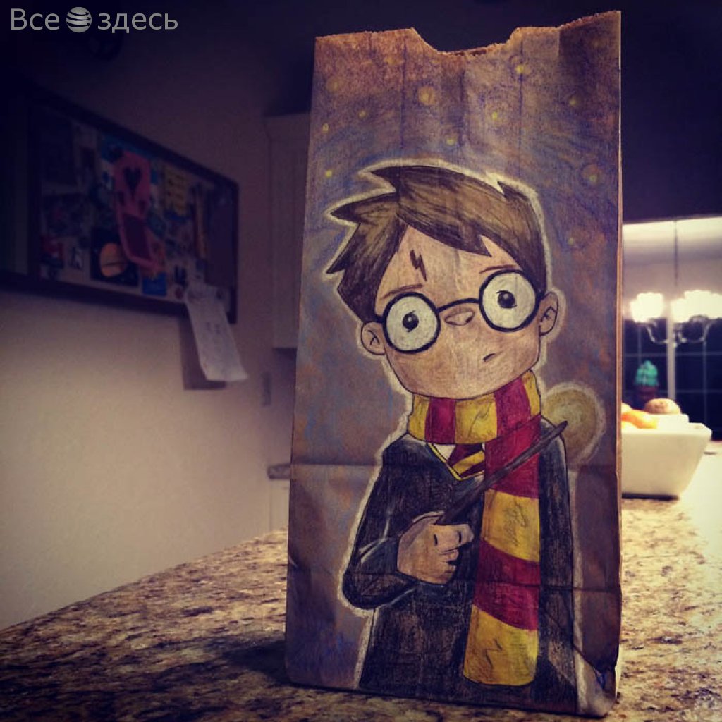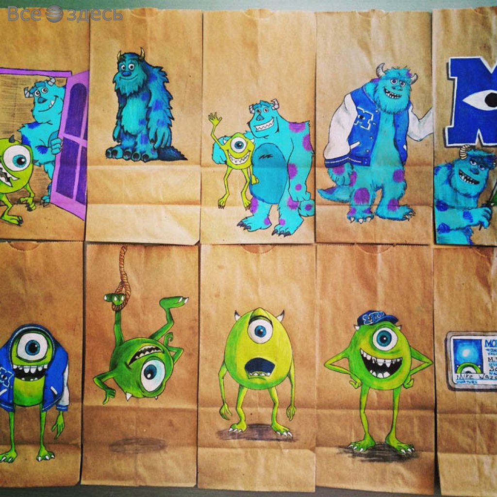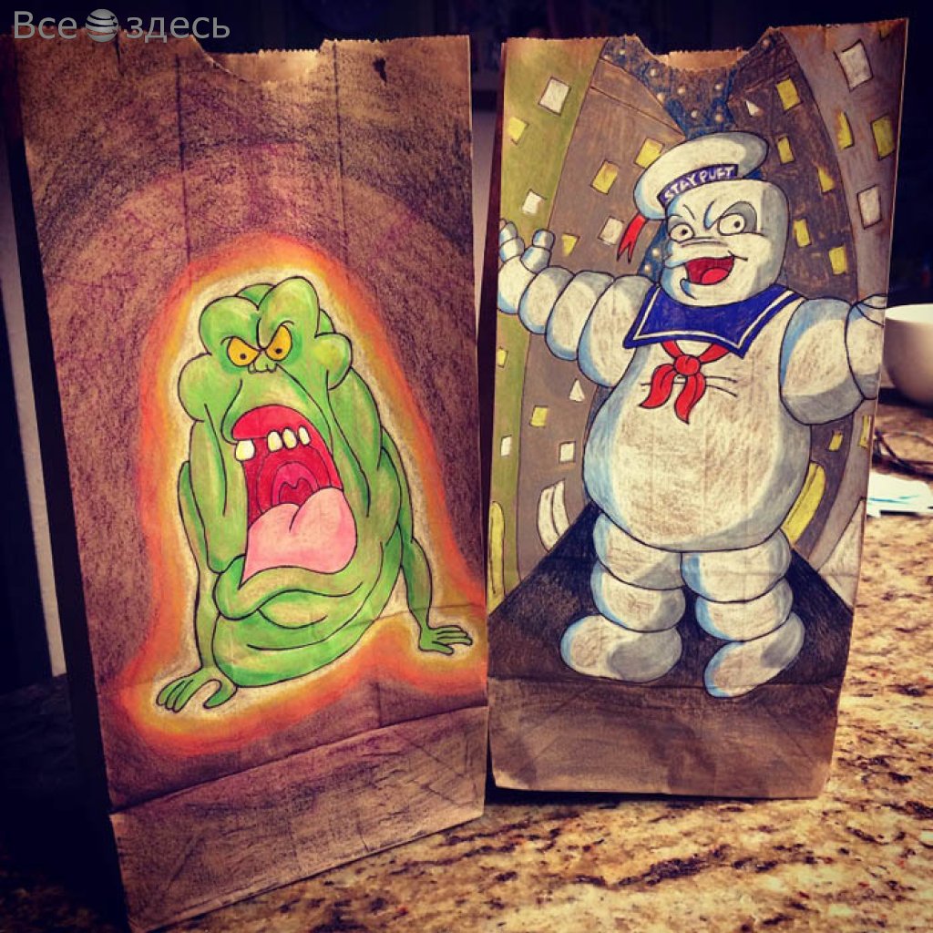 Как заставить ребенка пообедать в школе, если ему лень или не хочется, а столовой нет? Многие ученики так и приносят домой бутерброды, которые мама заботливо собирала утром, проносив их весь день между тетрадками в школьном ранце. Christy Kilgore – графический дизайнер. Она нашла интересное решение этой проблемы, используя свои профессиональные навыки. Кристи превращает бумажные пакеты в настоящие произведения искусства, и только потом кладет туда бутерброды.