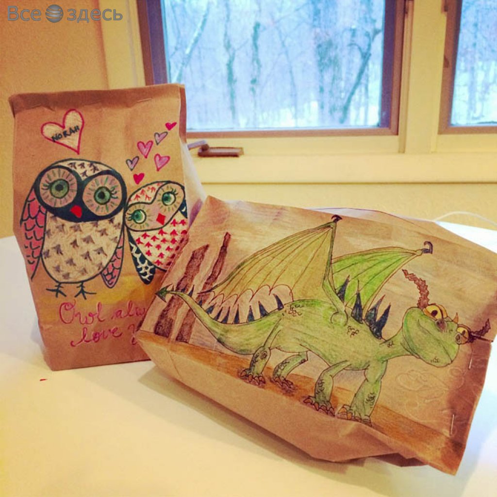 Яркие рисунки она создает при помощи цветных карандашей, маркеров и своего таланта. Фантазии Кристи нет предела – любимые персонажи из мультфильмов появляются на пакетах каждый день. Там же сказочные существа, яркие орнаменты и прочие чудесные рисунки. Заботливая мама тратит всего час на создание каждого рисунка, зато ребенок с нетерпением ждет очередного шедевра с бутербродами.