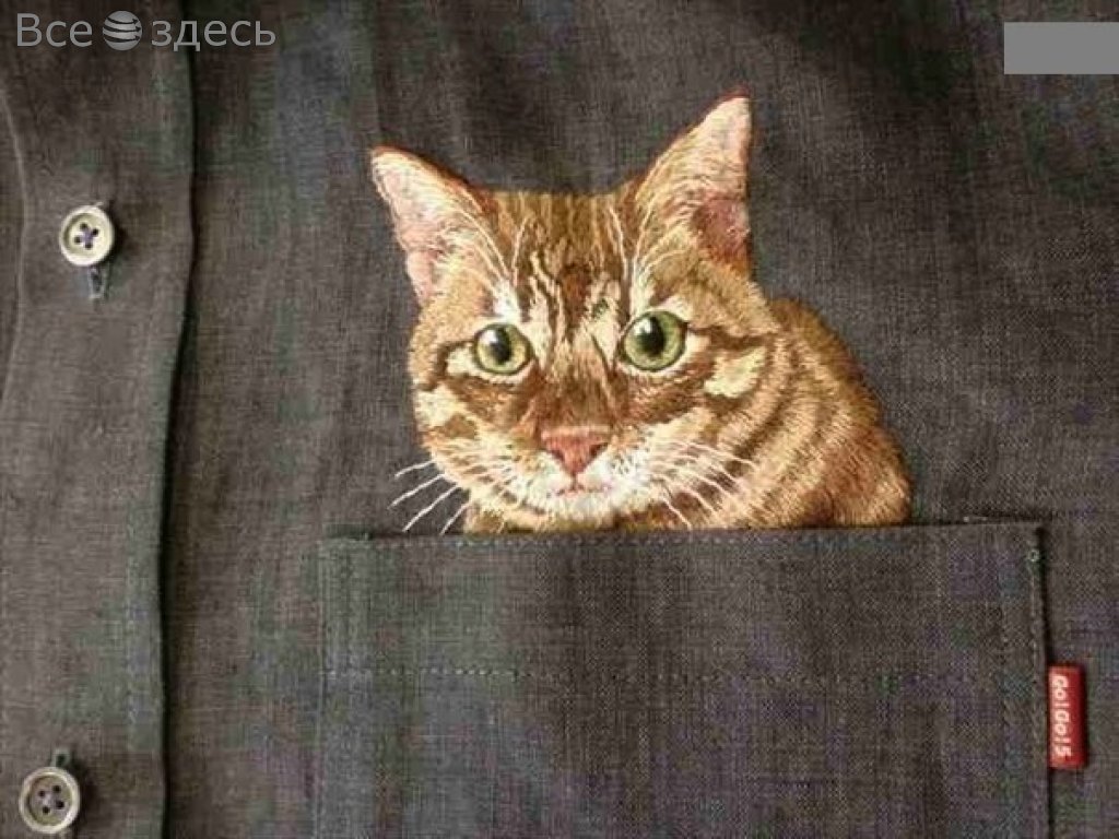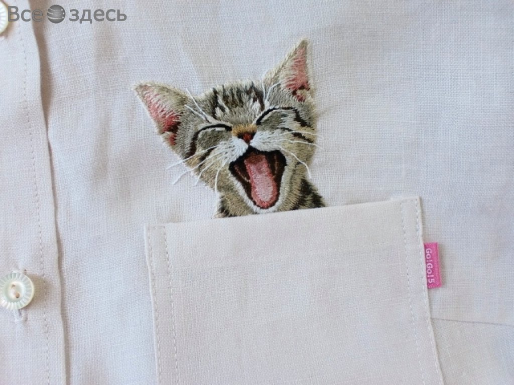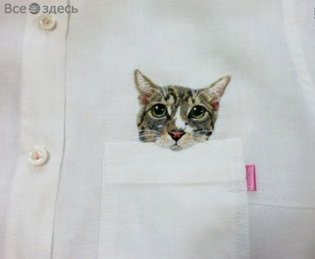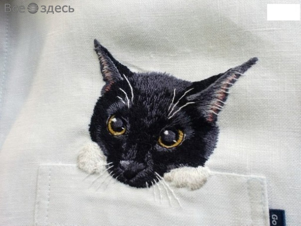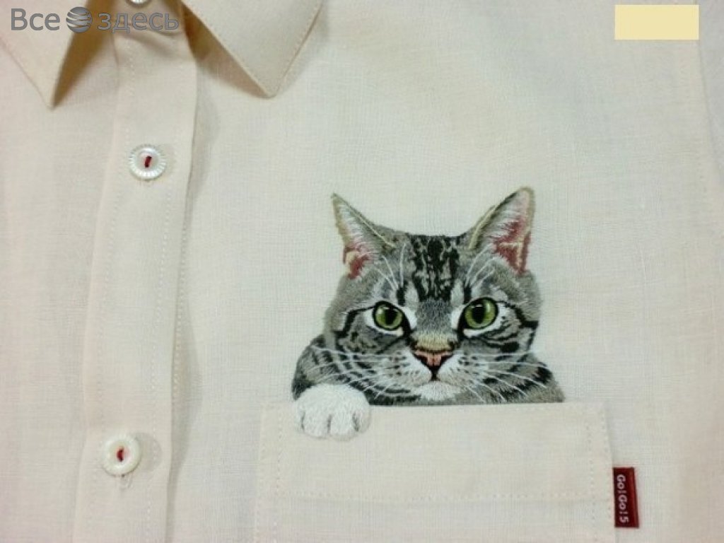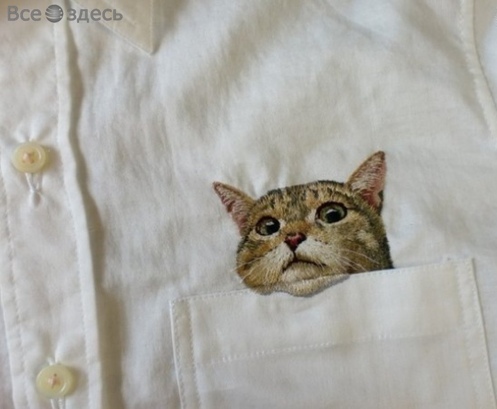 Хироко Кубота - вышивальщица из Японии, она мастерски вышивает котов, которые мило выглядывают прямо из нагрудных кармашков рубашек. Изначально вышивается котик, потом сверху нашивается карман. Вариантов усатых-полосатых у Хироко уже множество.