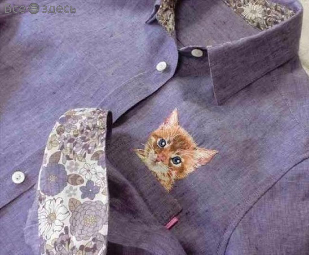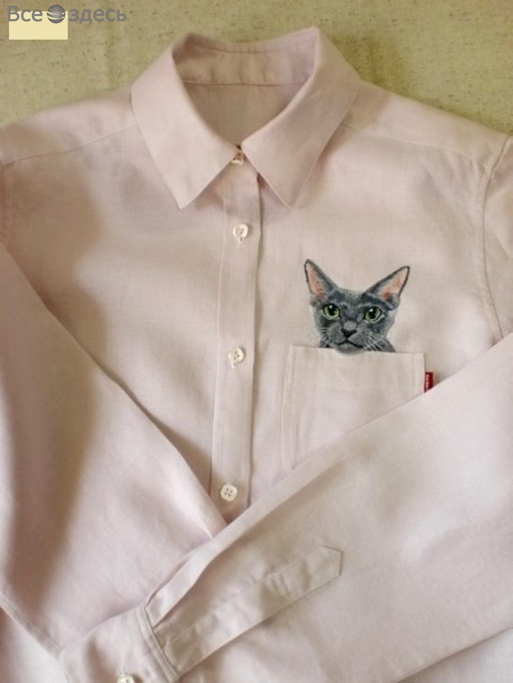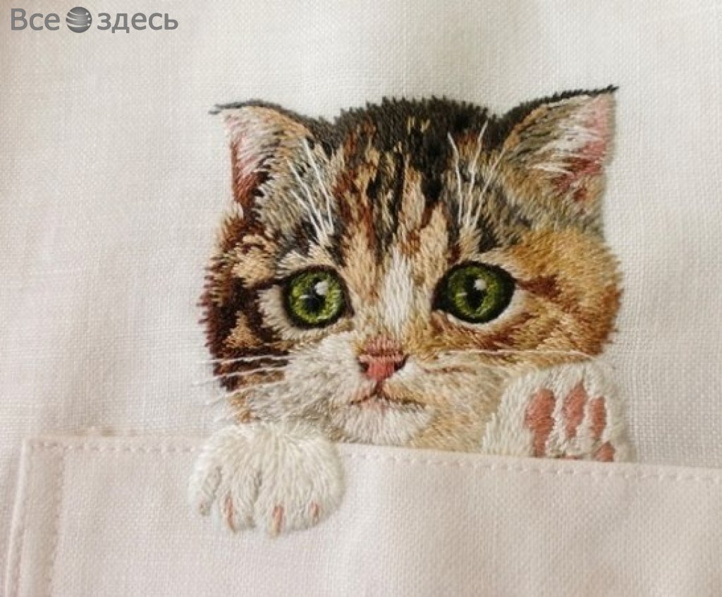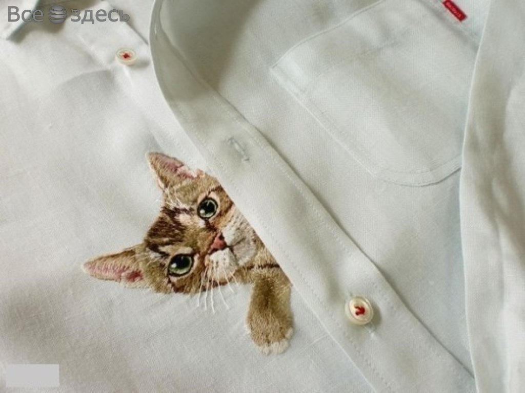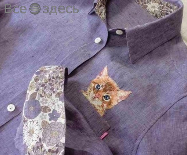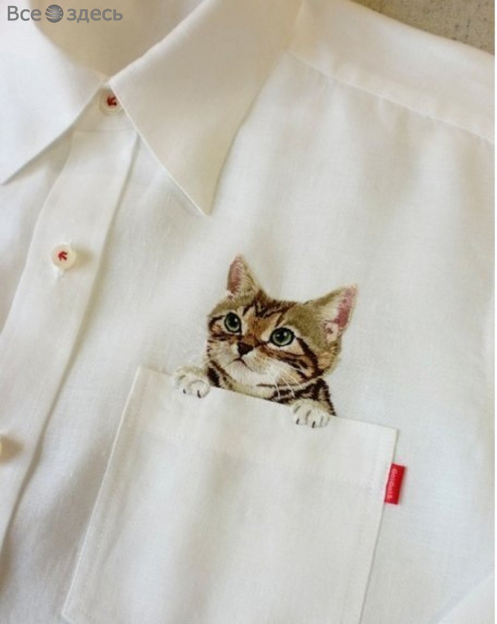 Хироко Кубота - вышивальщица из Японии, она мастерски вышивает котов, которые мило выглядывают прямо из нагрудных кармашков рубашек. Изначально вышивается котик, потом сверху нашивается карман. Вариантов усатых-полосатых у Хироко уже множество.